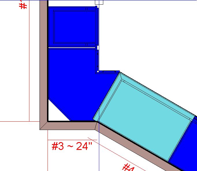 I have been beating my head against the wall for two days on this. Nothing seem to work well enough so far to give me a nice looking corner. I may just have to extend the angled wall straight so I don't have to do this angle stuff to the cabinets.