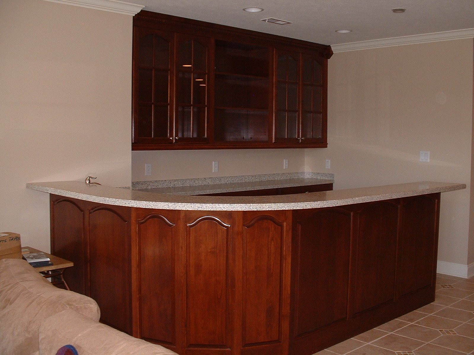 Here is a basement remodel that we recently finished. The wood is Alder, ML Campbell Cinnamon stain. Doors and Panels from Decorative Specialties. Ctops are Wilsonart Gibraltar.