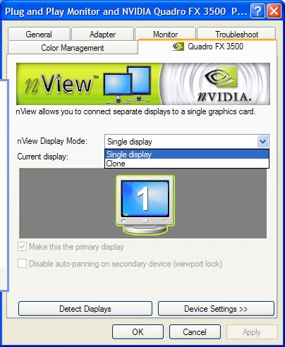 In the screen shot you posted, click on the advanced tab. Another box will come up, then click on the Quadro 3500 tab. Yet another box will come up with a dropdown box that will probably be set on clone. Click the drop arrow and select dualview and this should fix it for you.