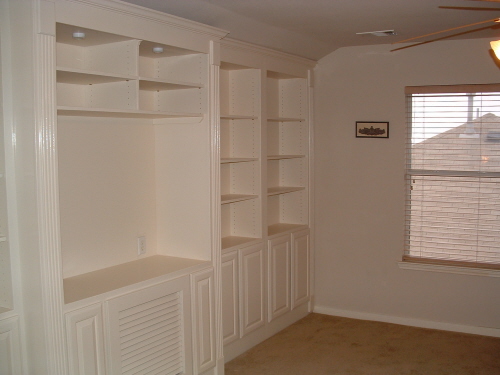 On this unit the bookcase is the wall. This is located in an upstairs room and there is attic space behind the case. There are studs in between the different sections. We removed the drywall of the old wall and repositioned the studs to allow the case to slide into the wall.
