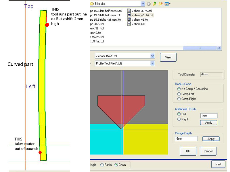 Ryan asked me to look into your issue. I would like to get aliitle more information just to make sure I know exactly how the piece is being created and then sent to the machine. You said you are working in metric so I want to make sure that you are in metric in ecabinets. Is your machine a metric machine by default also? I will assume that your Control Nesting and Profie Modeler are also set for metric. I can graph the code you sent in and see a big sweeping arc that shouldn't be there but when I open up your CN settings and then the mdf door tool options and set the interior tool to use custom tool 132 the code looks fine for me. Can you verify what version of Profile Modeler you are using? I'm sorry for all of the questions but it could be something very simple that we are overlooking. There is also one last file thatt I need to have you get from the machine and send in. The file is called "toolset.bin" and it is stored in the "C:\Profile Modeler\Tools" directory. Please email this file to me at ddvonder@thermwood.com. I'm going to try and get this resolved as fast as I can for you.