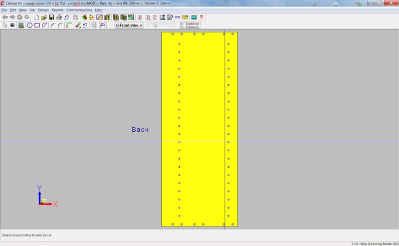 That attached picture shows a cabinet side that I am adding 5mm hardware holes to. With the current PE mode to create geometry cuts, I have to click the mouse 44 times for each end of the cabinet (88 clicks - I'm getting carpal tunnel
