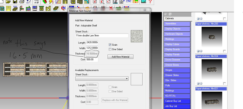 The only material that is shown under the add shelf settings in the construction settings is the 3/4. Is this the correct cabinet? Does this happen with this one cabinet or others? When I added your cabinet the only material it had me add was the 3/4 Abet NG G1S. There was no 3/4 Abet NG G2S. Please double check the cabinet and let me know.