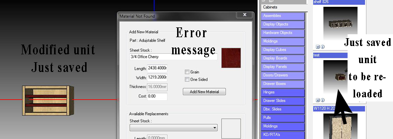 This issue was documented awhile back on the beta site and will be resolved in the next release. The issue may not be immediately evident if someone does your steps with same thickness materials. The short of it is that the adjustable shelf material is getting messed up with the fixed shelf's thickness. So, if you change the cabinet globally using your steps to a 1/2" thick material, then change the adjustable shelf's material to 3/4", you will see that the adj. shelf will add in with the 1/2" thickness. To get around this for now, change both fixed and adjustable shelf materials to the same each time, add your adjustable or fixed shelf, then change both materials again to the same (should you need a shelf with a diff. material.). Hope this makes sense, and sorry for the inconvenience.