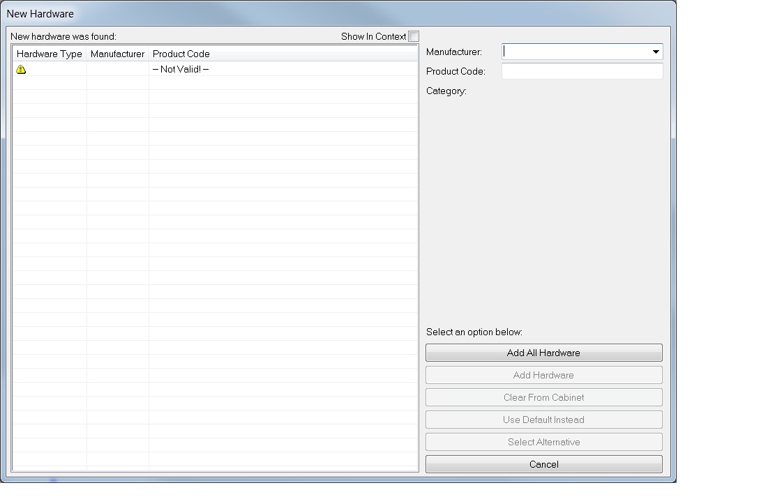 Everytime I open a cabinet I seem to get this dialog. I click on the button 'Add All Hardware' each time, but when I go to save the cabinet, for some reason, a setting is not getting set saying I added all the hardware. What are the steps I need to do to keep this from coming up each time?