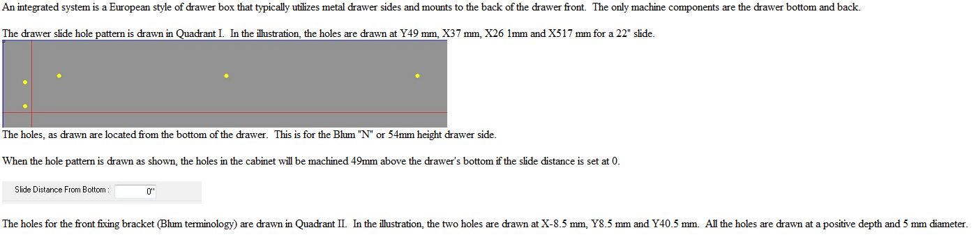 OK, let’s say that the majority of you can convince us to consider changing the left/right positioning location from the drawer box side to the cabinet side… How about the bottom position then? Currently it positions from the bottom of the box as well. Is that OK or do you want that to be positioned from the bottom of the opening and if no bottom cabinet part divider exists from the bottom of the drawer front? Keep in mind that the original slide pattern for the sides have always positioned from the bottom of the box and this behavior cannot change. Forrest, you expressed the want to use this for attachment holes from the drawer front to the Dbx front and for some type of adjusters, will positioned from the bottom of the opening and if no bottom cabinet part divider exists from the bottom of the drawer front work for your wants? Keep in mind that there are multiple systems out there (Metabox, Tandumbox, Metafile, Zargen, Moovit etc.) and each seems to have dimensions that vary some. We of course want this to be flexible and work for all these variations but want it to be simple. Also, keep in mind that the intended scope of this is for integrated drawer systems. Everyone's input would be appreciated.