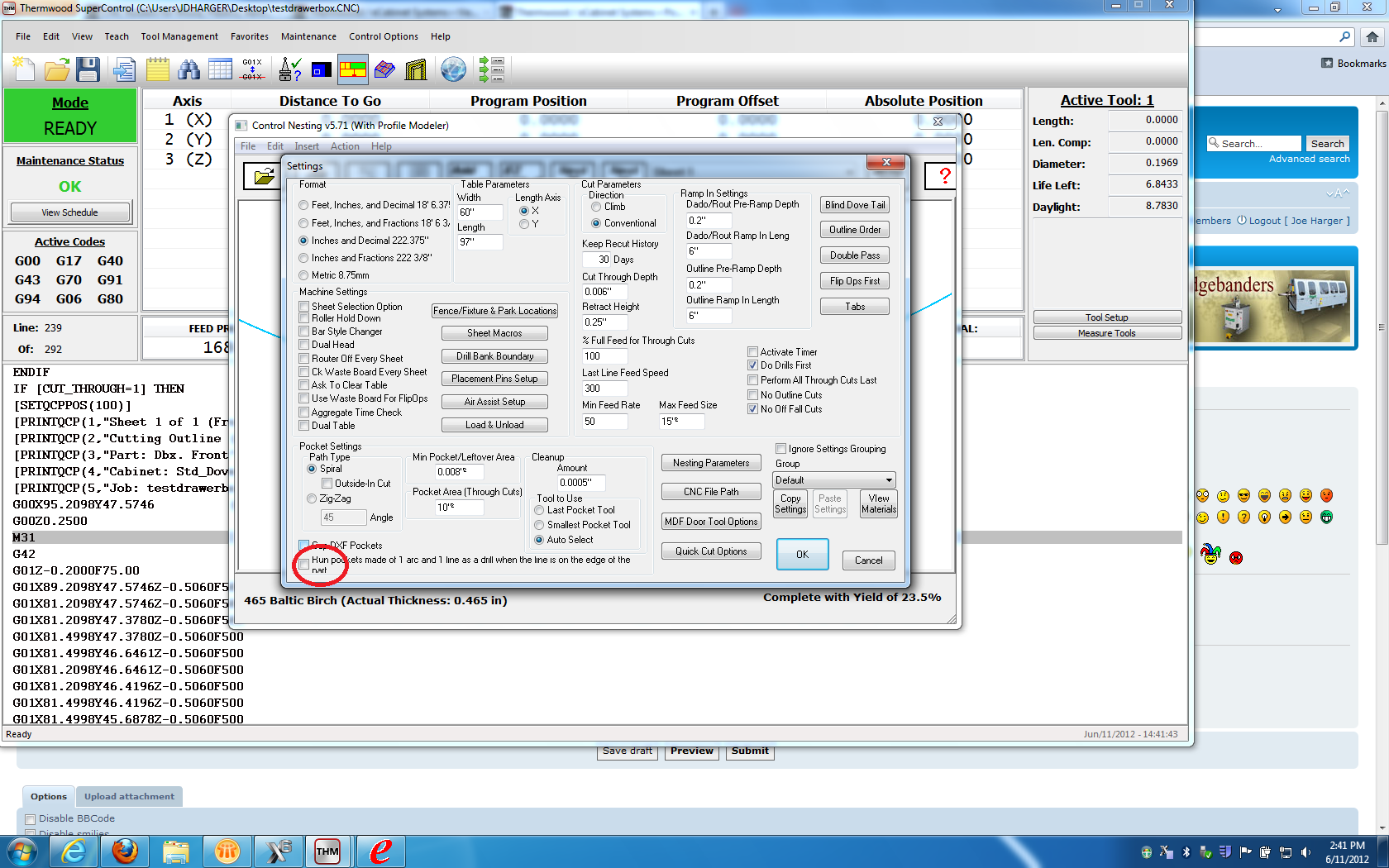 Hello, it looks like in settings the run arcs tab is causing the situation...uncheck this tab and see if it just pockets that area instead of following the circle around the part. We are doing some further studying of your file to make sure it isnt the way part was created that is causing the problem. I did a quick test creating drawer box and seem to be finding the same thing....uncheck this for now and let me know if it fixed it....