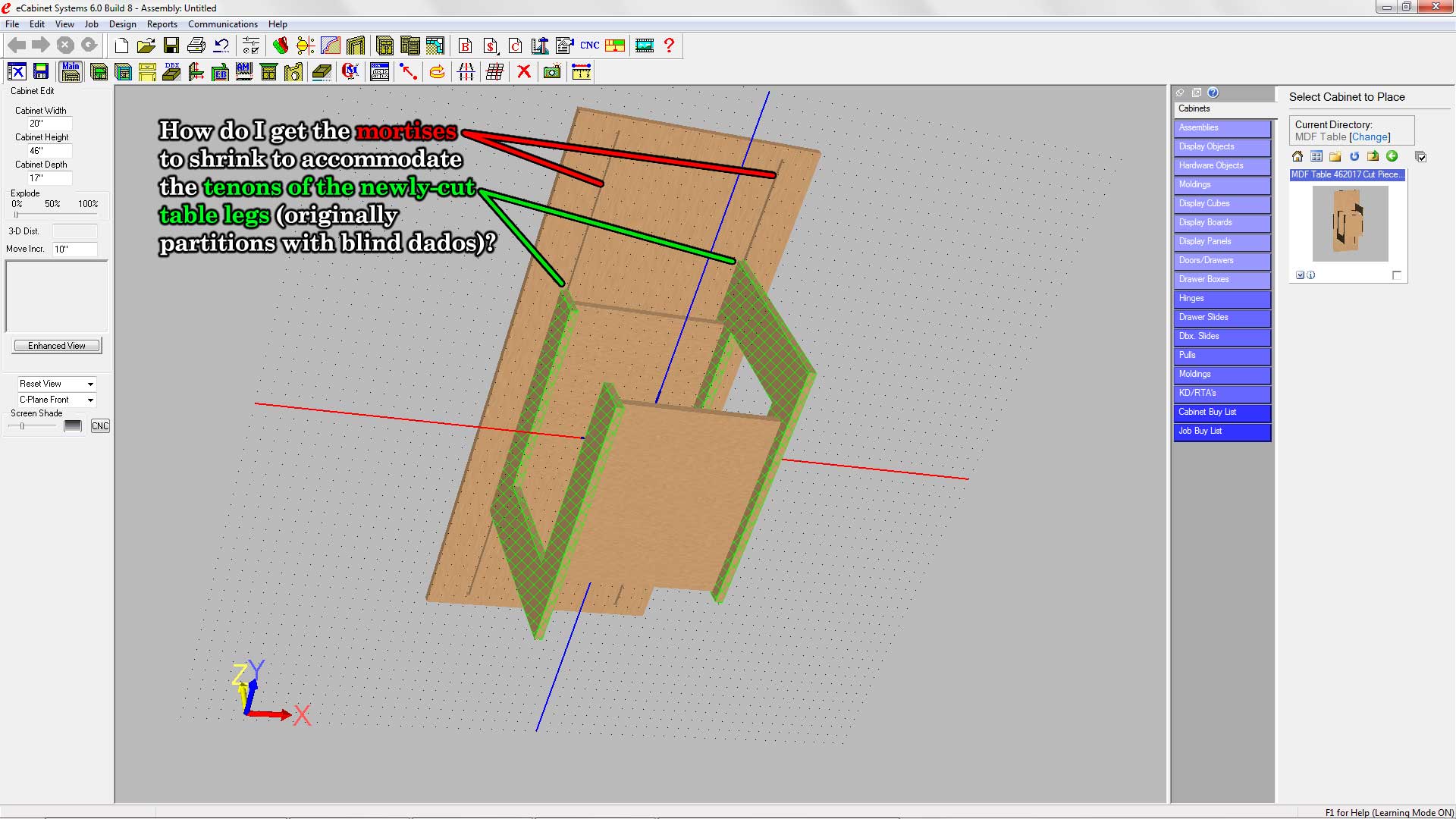 The problem: The mortises for the table legs remain the original length of the partitions before they were cut to size in the Part Editor.