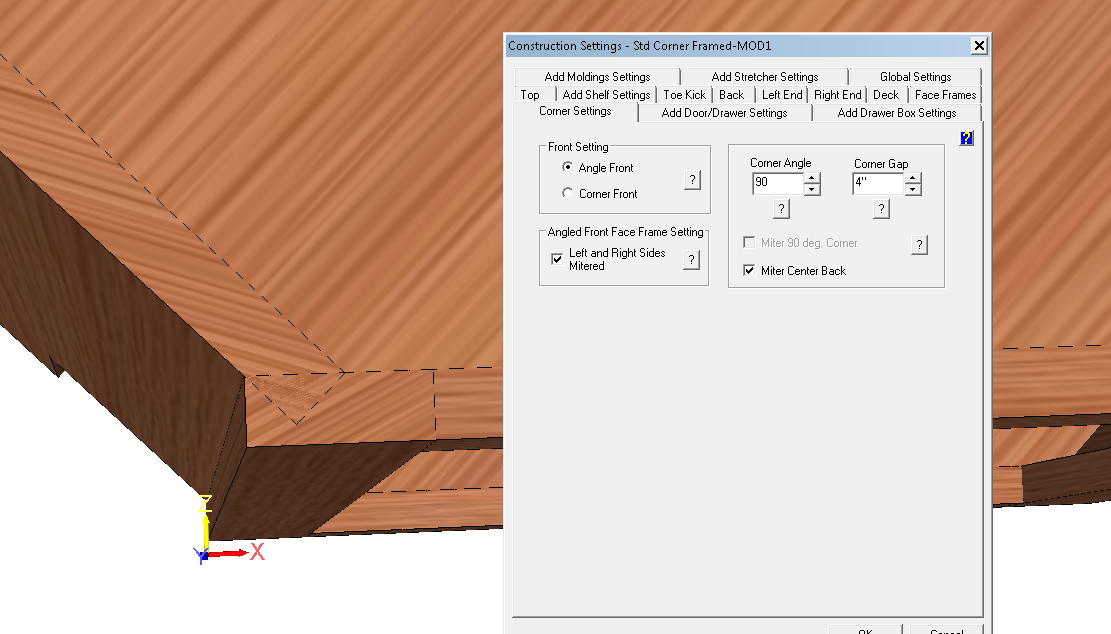 I have a question about corner cabinets, im trying to make one like they make them here where i work, it has faceframes and a front angle, the faceframes thickness are 20mm and the left and right ends can be of 18mm or 12mm, but i end up with this kind of construction.