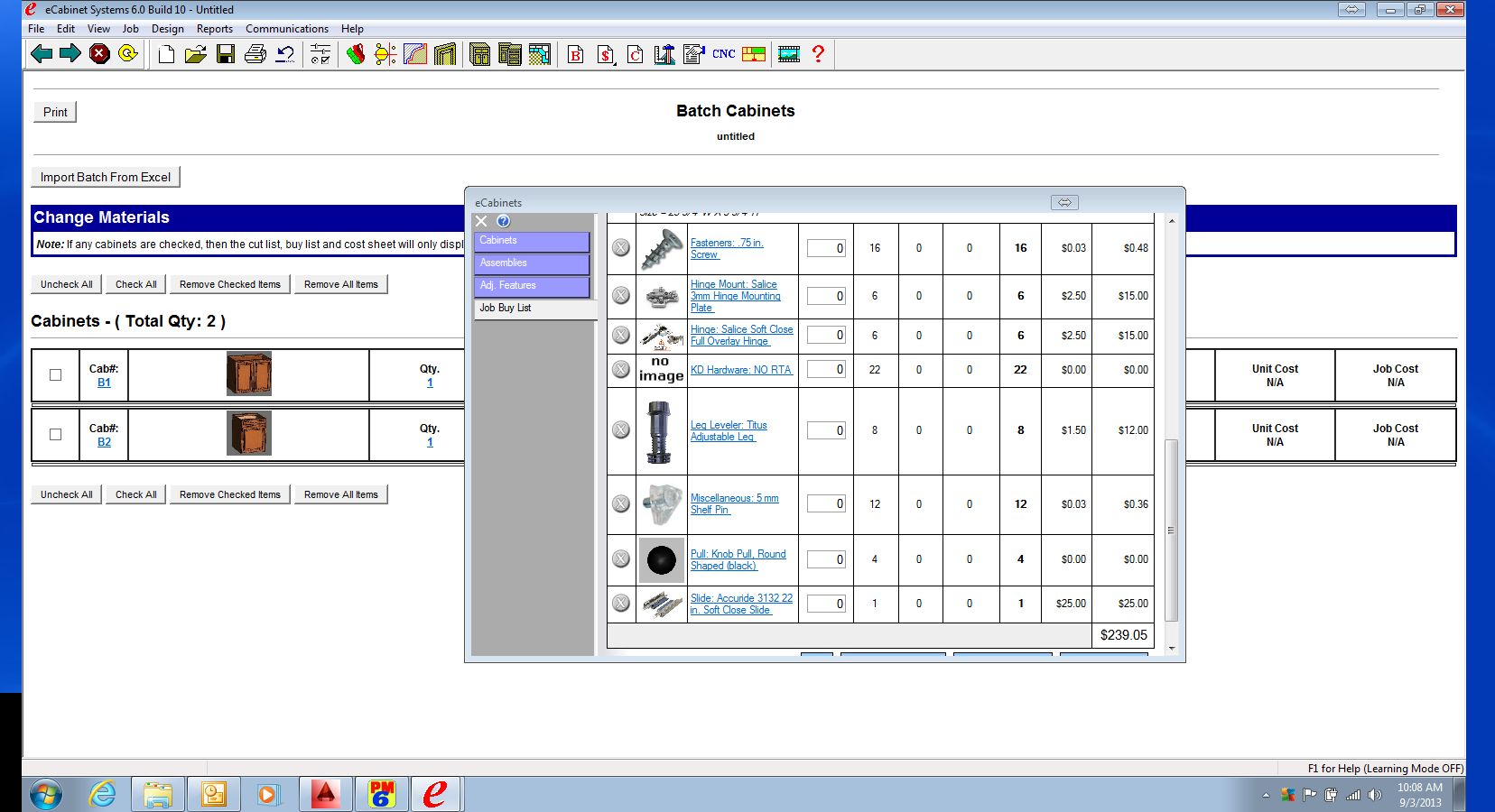Kerry, if you don't mind me asking I couldn't help notice some of the hardware that you had in the buy list. The leg levelers and shelf pins for instance. Are you adding them in manually or is there a way to have them associated with a cabinet that makes that hardware get added automatically? It would be nice if it it could but manually can still work.