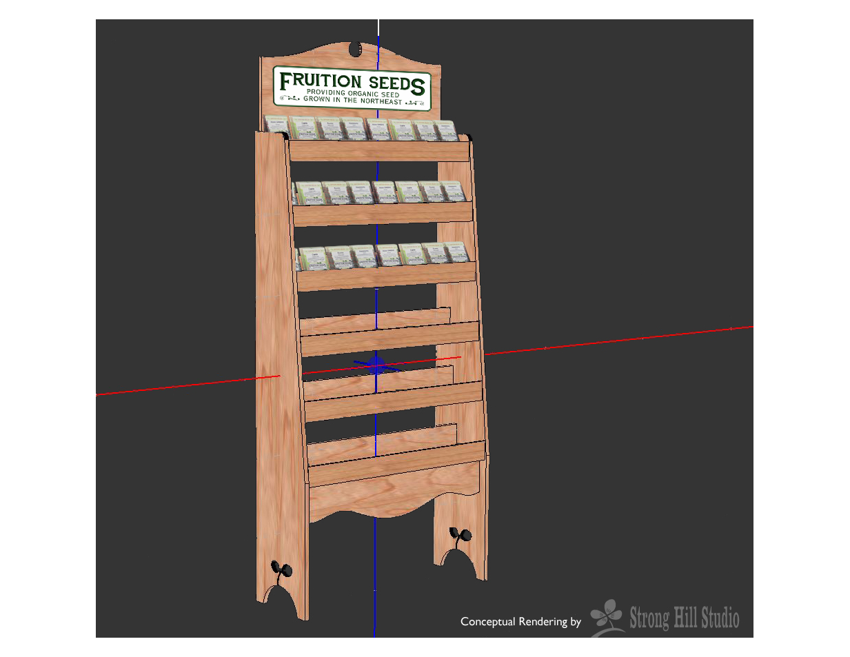 I've included a JPeg that shows some simple elements that were part edited for a simple seed stand were building. As you can see, there's some simple pocket cuts in the sides of the display. A little seed sprout that is usually between the 'Fruition Seeds' type on their logotype. To simplify and keep costs within budget we removed the seed pod from the graphics and used it elsewhere. All done in AI. The placard will be getting CAM'ed out in another package but the rest of the cabinet will be handles by good ol' e-cabs. The image was composited using Photoshop (another Adobe standard product).
