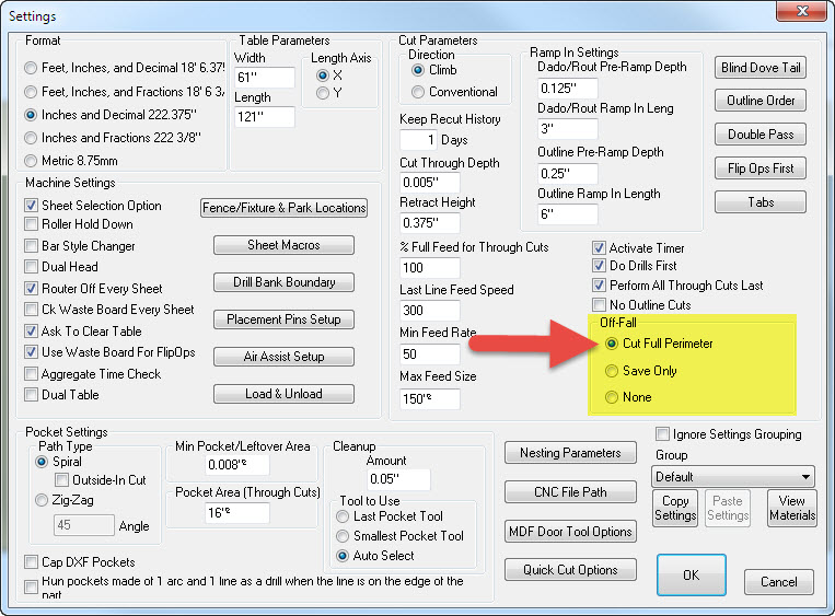 Perhaps the issue is more with the selection regarding the handling of Off-Falls. You now have the option of Cut Full Perimeter of the Offall, just Save Only where the "raw" shape is saved or ignoring (None) them altogether. If the Full Perimeter is not selected, then... well you probably won't get your rectangular shapes.