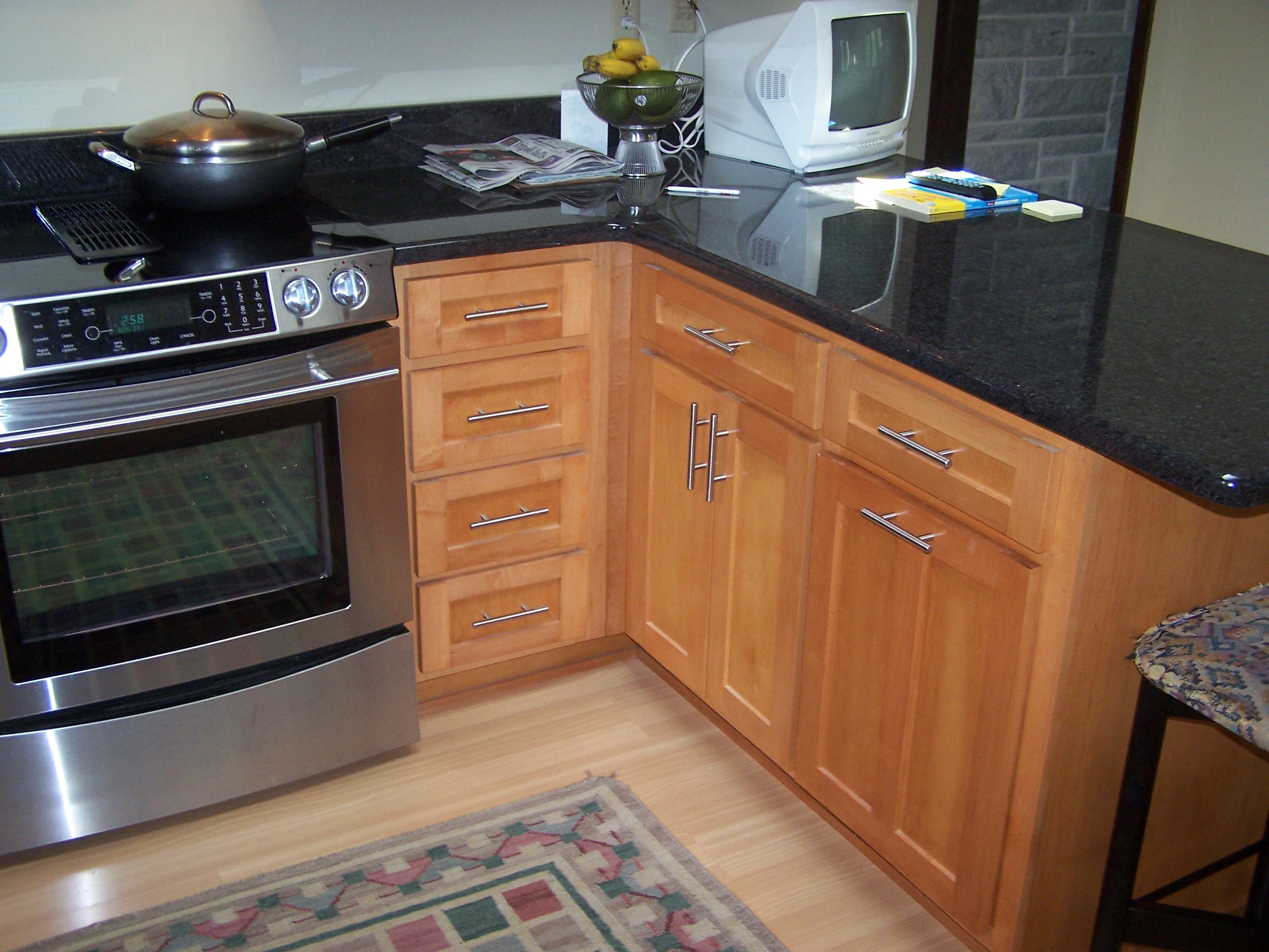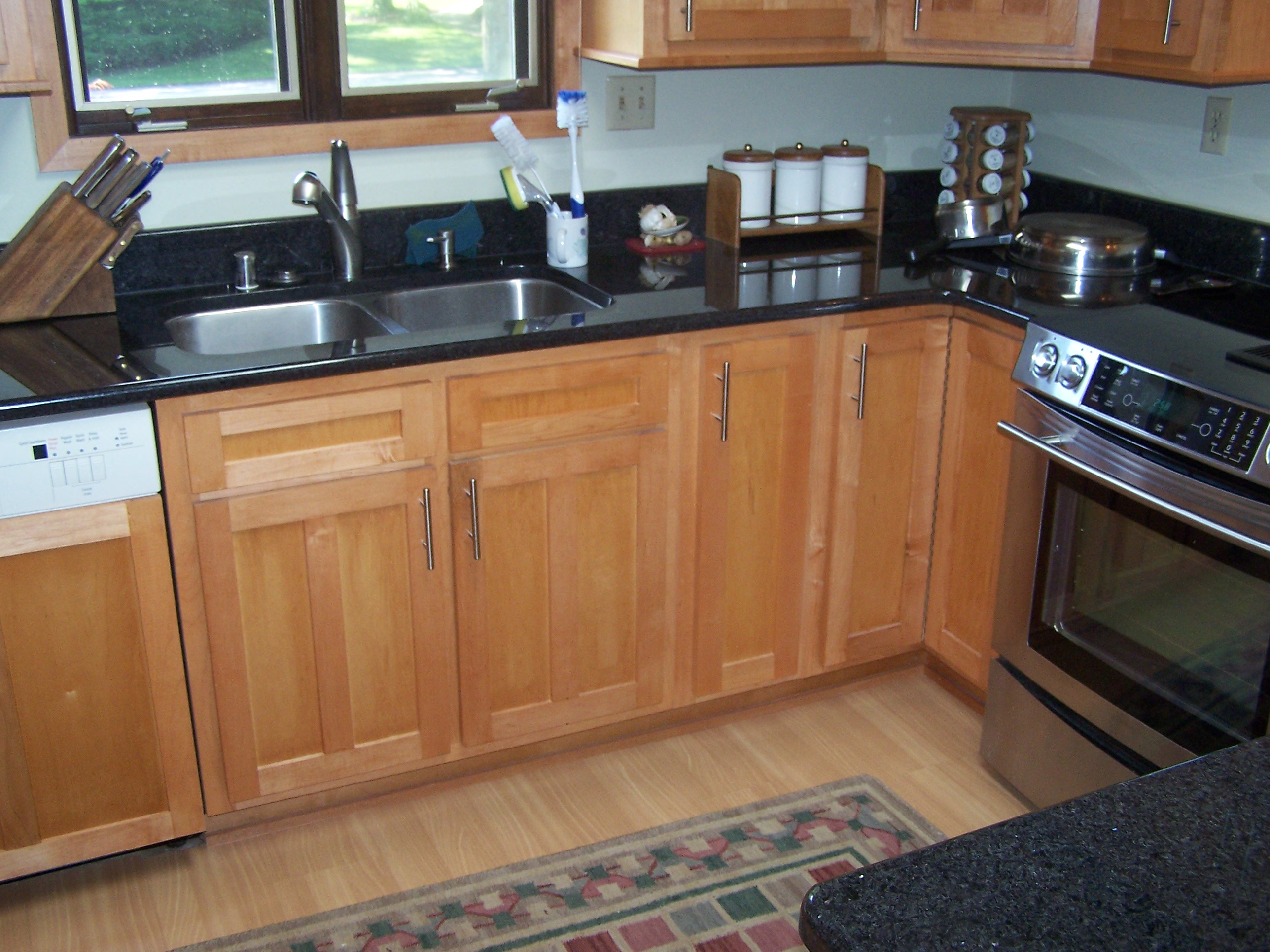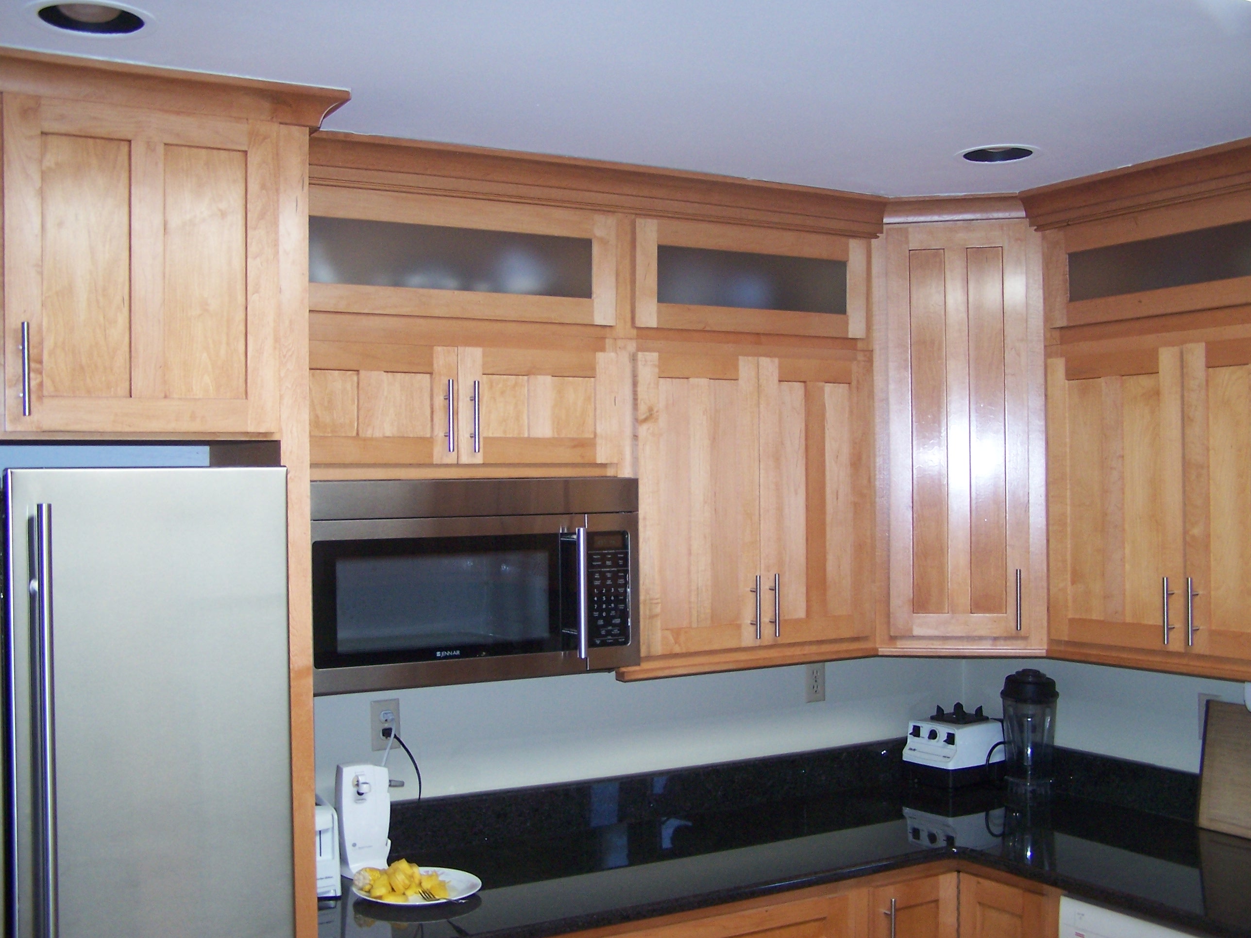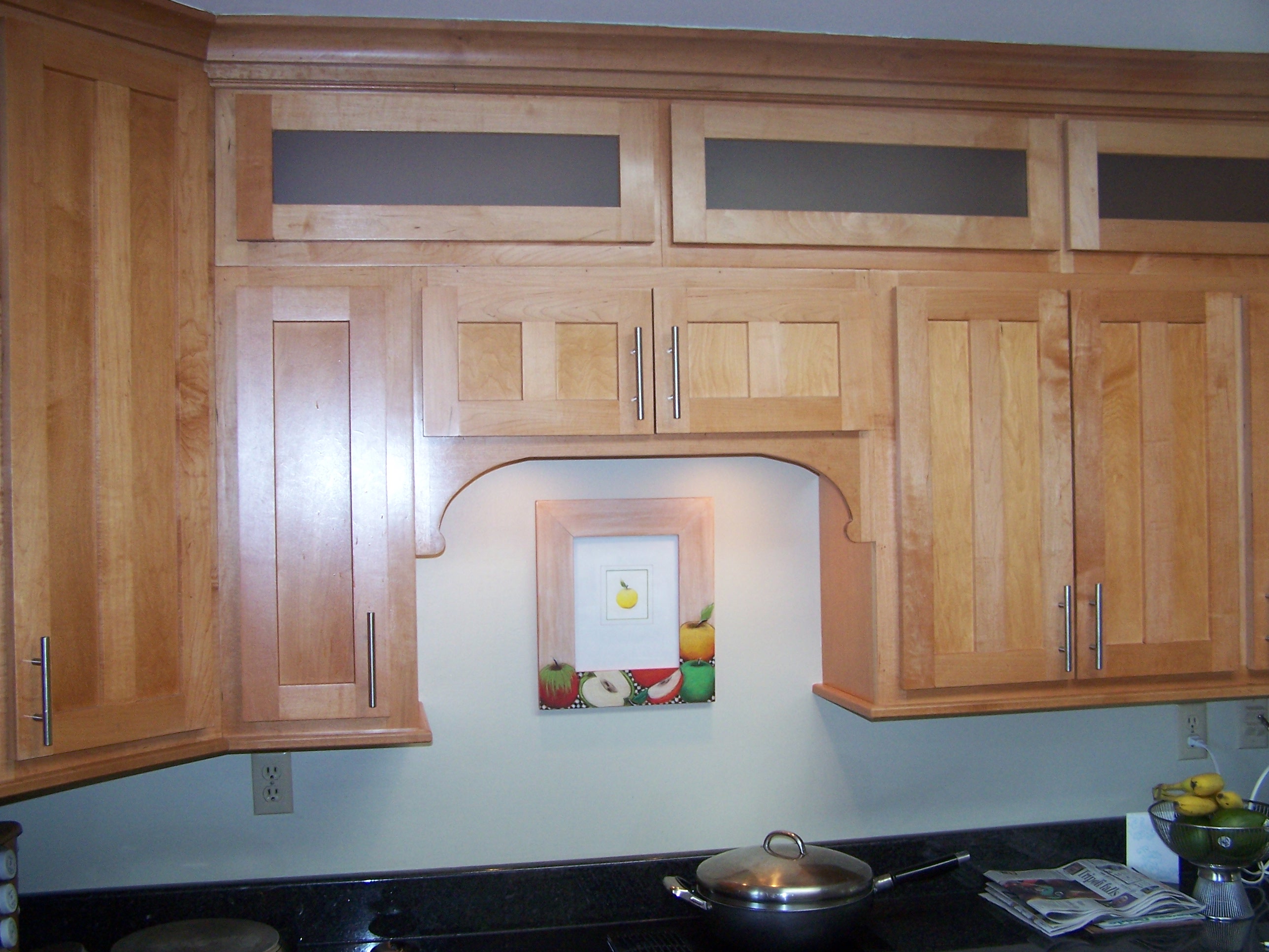 Here is a recent kitchen made of maple. It was a complete remodel. Frosted glass with flipper hinges help stow away items above the upper cabinets.