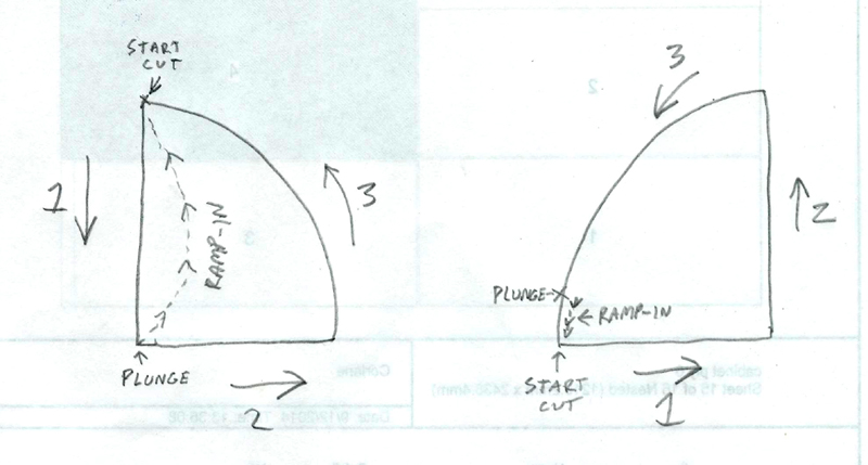 This is with CN 5.79. The part is supposed to be a 1/4 circle. The arc cut through the center of it is the ramp-in created by CN. It started in the lower left and ramped to the upper left, and then proceeded to cut normally from the upper left. (conventional cut direction).