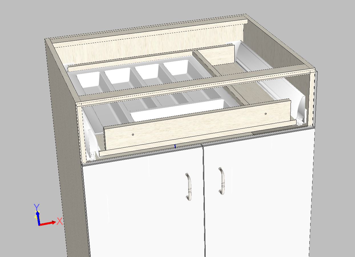 With wide drawers the only attachment is the brackets holding the front to the drawer side. Really anything over 600mm 24" seems to need a fixing to the bottom of drawer. We use a small L shaped light gauge metal bracket which looks a bit handimanish. I was wondering how other Ecabinet users did this. I wish Ecabinets could predrill a pocket hole in the drawer bottom based on the maths so one or more holes are drilled based on the width of drawer bottom.