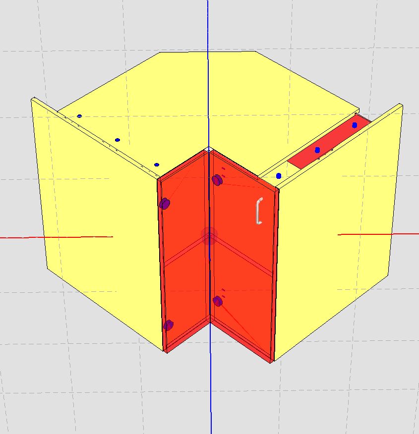I am trying to build a base corner cabinet to match our current construction. We build it with an angled center back 16mm thick dowelled into the top and deck, with bevelled and grooved left and right sides. Then a 4mm left and right back full dadoed into the top, deck, and gables, and into the groove on the center back.