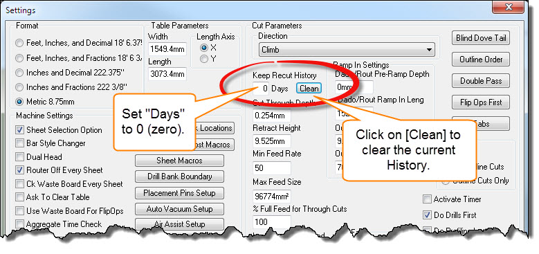 In the Control Nesting [Settings] dialog, set the "Keep Recut History" to 0 days and [Clean] the existing History file.