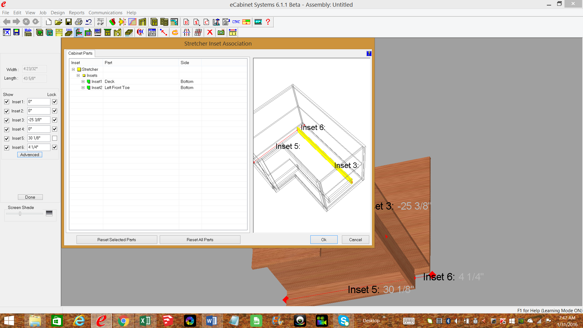 I set the right inset (the finished end in this case) to be the toe kick inset (3 ½” in this case) – the right end thickness. (3/4” in this case) This came up to be 2 ¾”. This gave me 3 ½“from the outside of my finished end for the finished end toe.