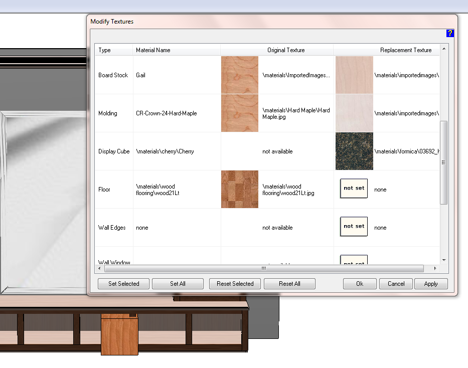 I added a 12" square display cube to a room and gave it a cherry wood texture - to change the color in the room while in render mood just right click the mouse and select Modify Texture then select whatever color you need then render again Hope this helps a little