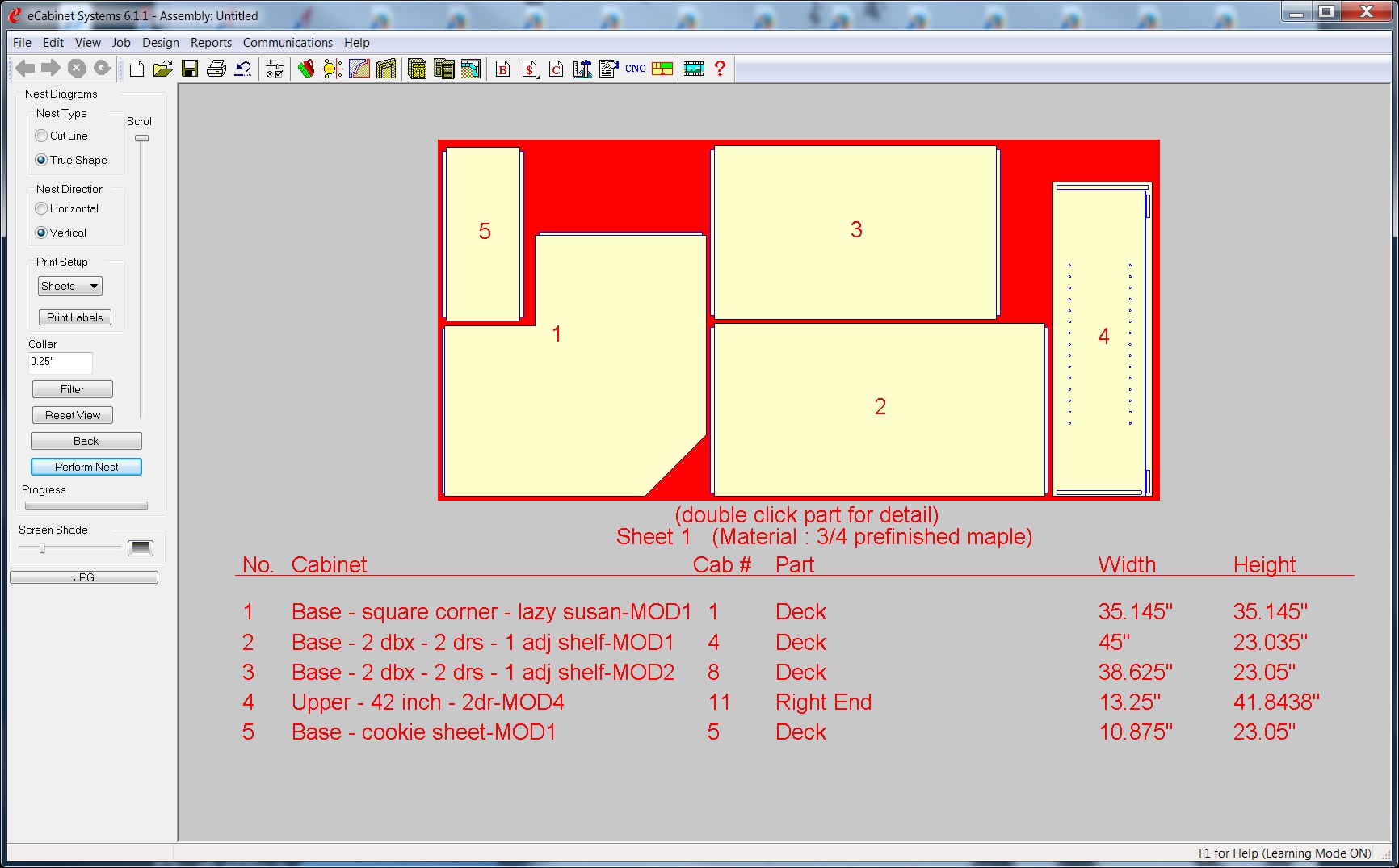 The first picture shows what happens when I perform a nest on a Custom Layout of cabinets. The second picture shows when I take that cabinet into CE and perform a nest. In the first picture, the cabinet side is rotated to go cross grain on the plywood. In the second it is laid properly on the sheet going with the grain.