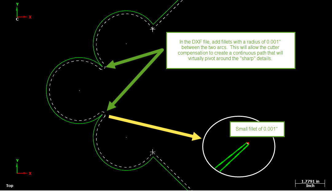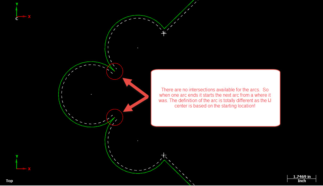 The only thing is, is that since the first arc and second arc did not have an actual intersection in the calculated compensated path, the tool was NOT at the correct starting point for the next arc/lobe. So the INCREMENTAL ARC CENTER, defined an incorrect radius and center point for the next arc/lobe.