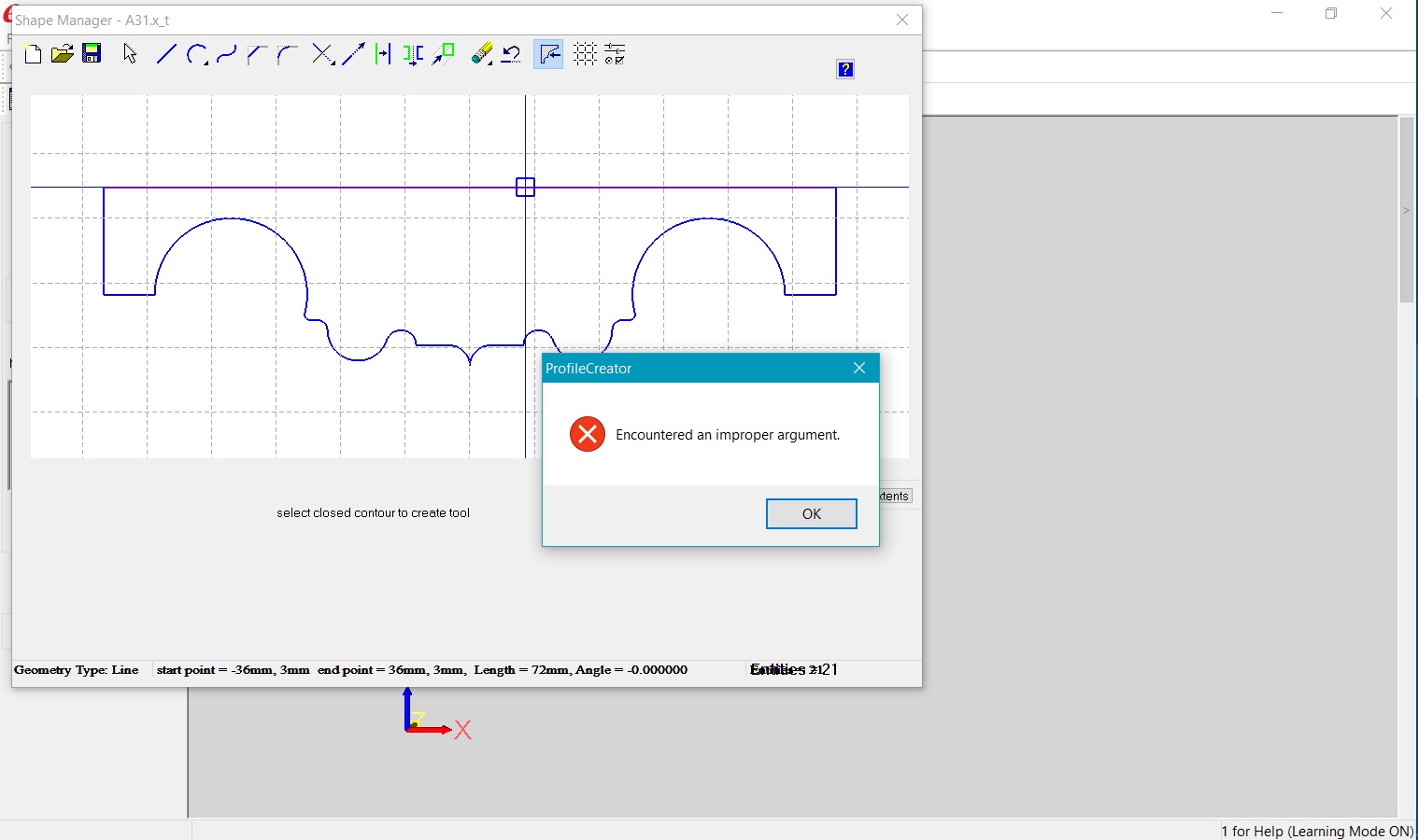 In the shape manager when I try to select the shape after clicking on the icon to create tool I get an error message "Encountered an improper argument". I'm not sure what my next step is....?