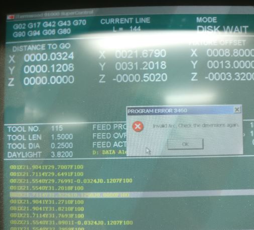 I've seen this error several times now where I have a J0.0000 command in the male dovetail routing section of my program. Has anyone else seen this before? Could it be as simple as changing some of my tool diameters? Any info is appreciated.