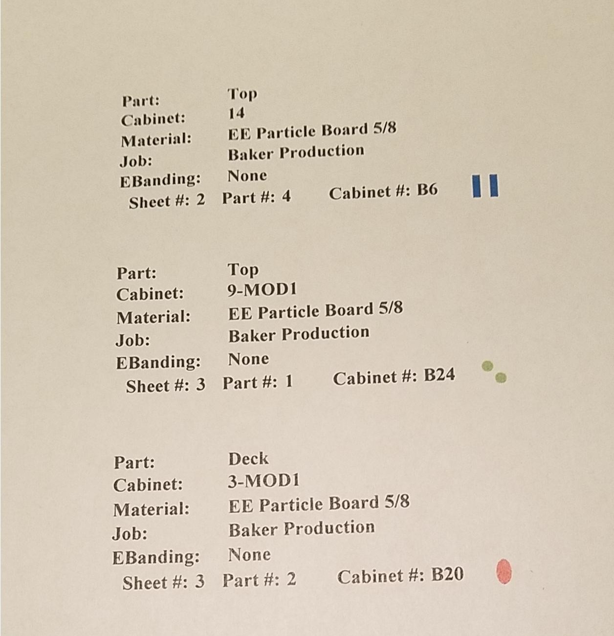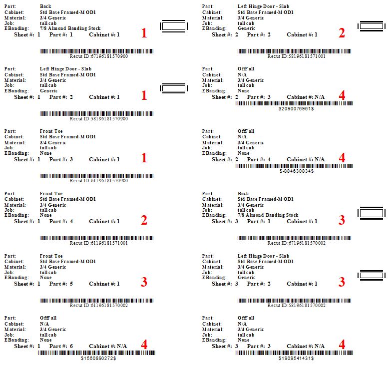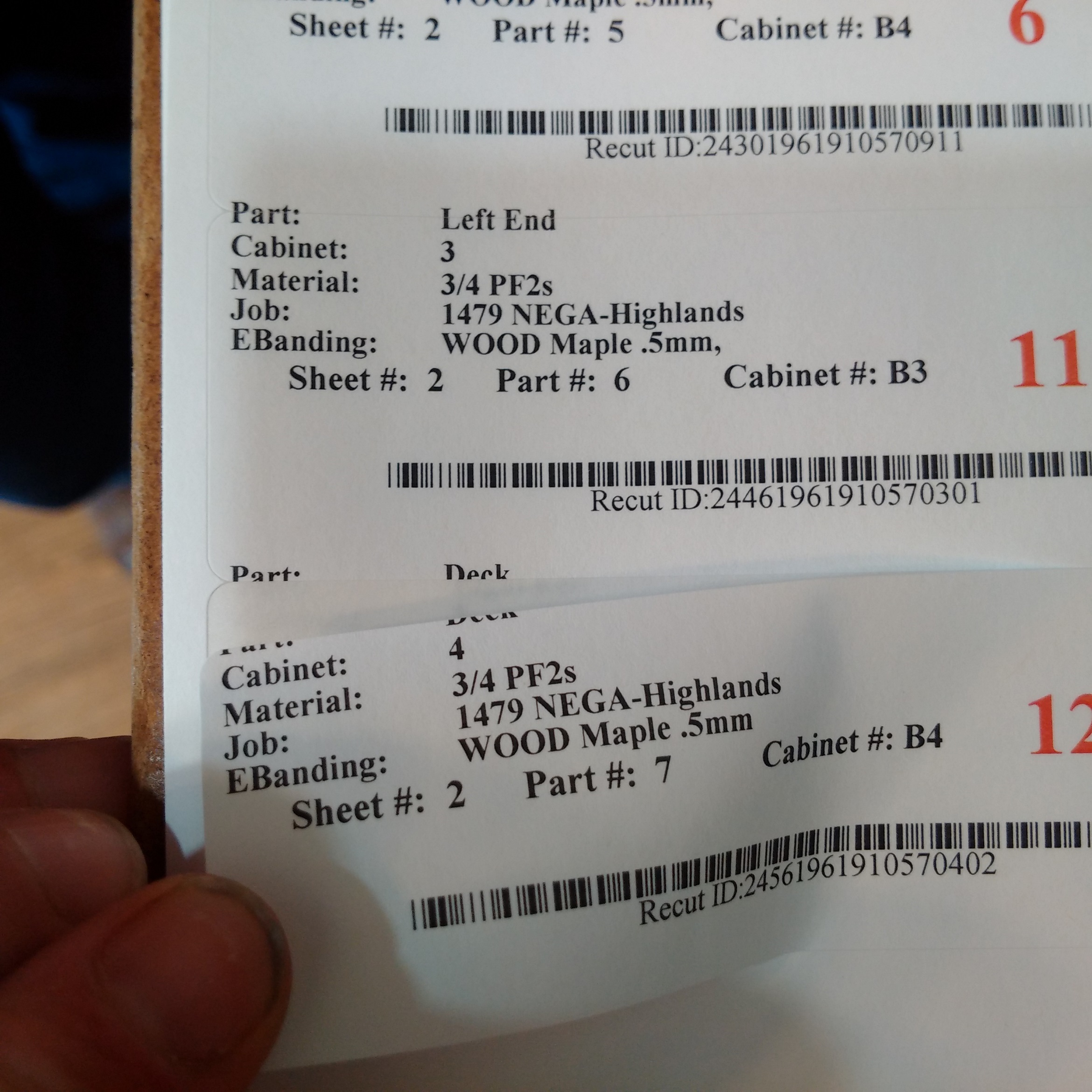 Attached are the two label files. Give them a test and let me know if they need to be adjusted. Seem to look OK on mine. I realized my mistake in thinking there was way more room at the bottom. Technically could go bigger on the number, but longer job names may interfere. The number shouldn't go any higher than the edgebanding material name line.