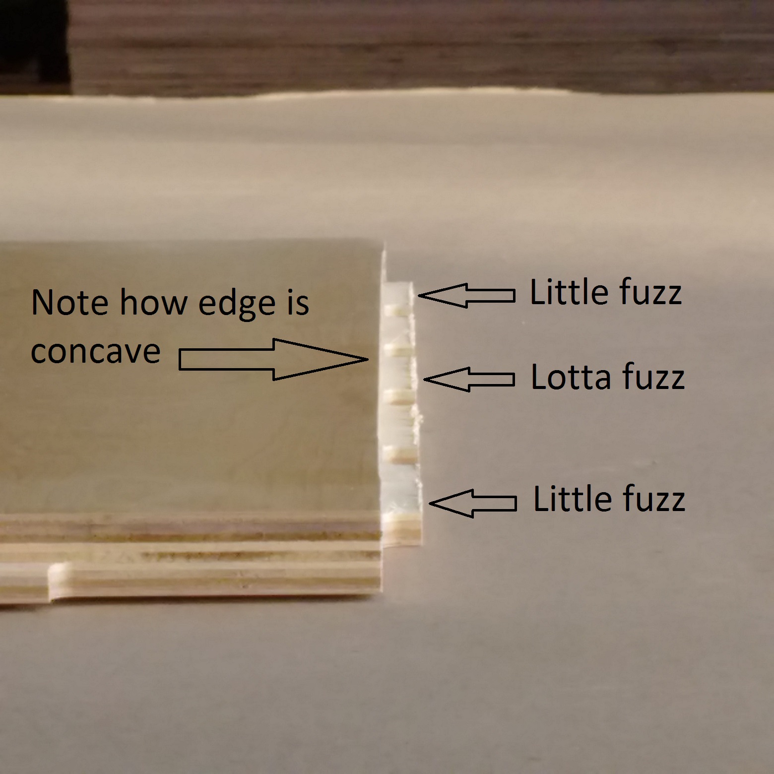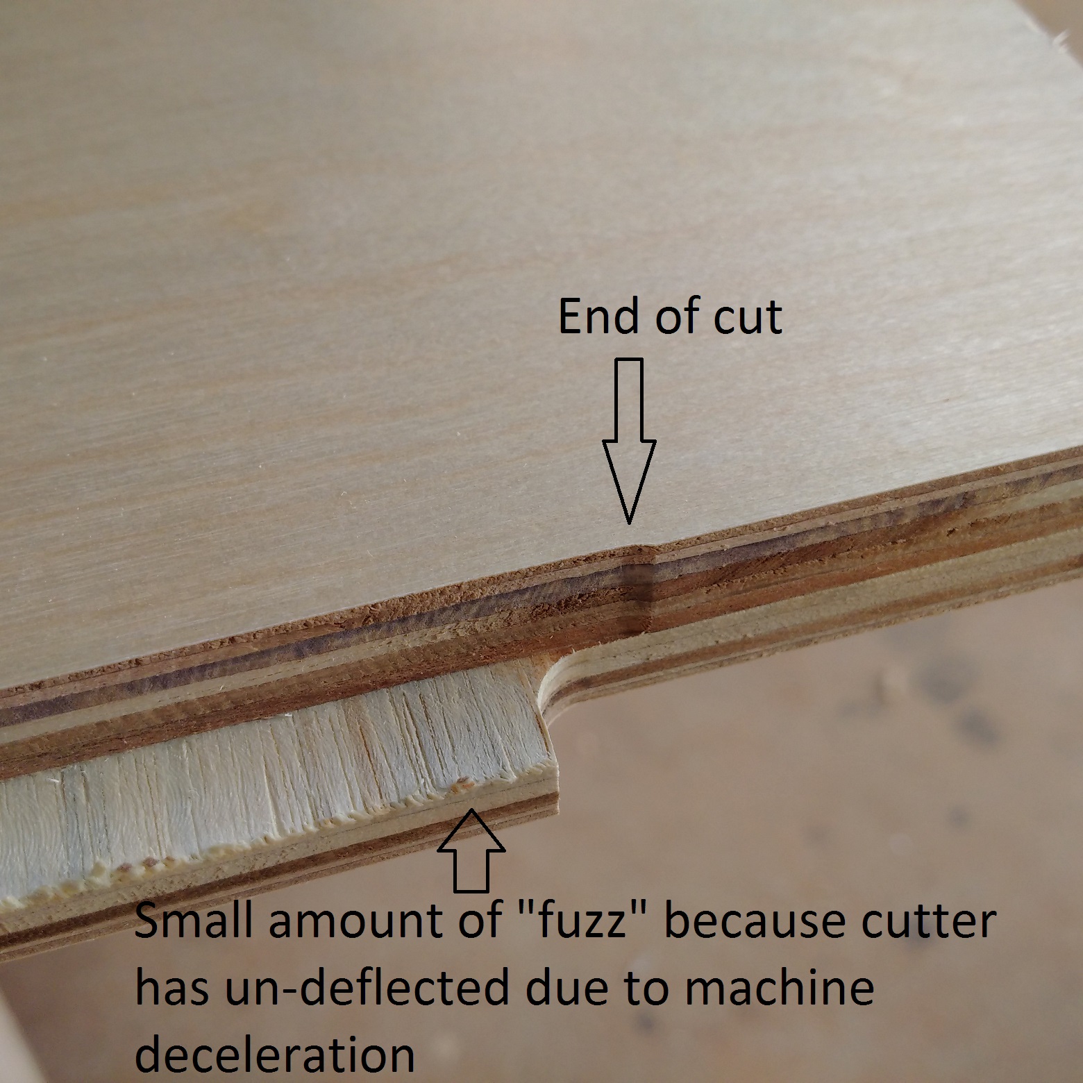 By "the whole edge being cut on a single pass", are you referring to the Single-Pass Tenon? If so, the beginning of it looks just like the end that is shown in the picture, except it has the arc ramp-in. The entire length of the Single Pass Tenon cut is an arc, due to the machine's acceleration and deceleration - therefore the ridge shown in my picture is largest at the center of the cut. Our outline cuts are set to Climb cuts down to the skin thickness, then the final outline thru-cut is Conventional. If I'm misunderstanding you, let me know and I'll be happy to send whatever pictures you may need.
