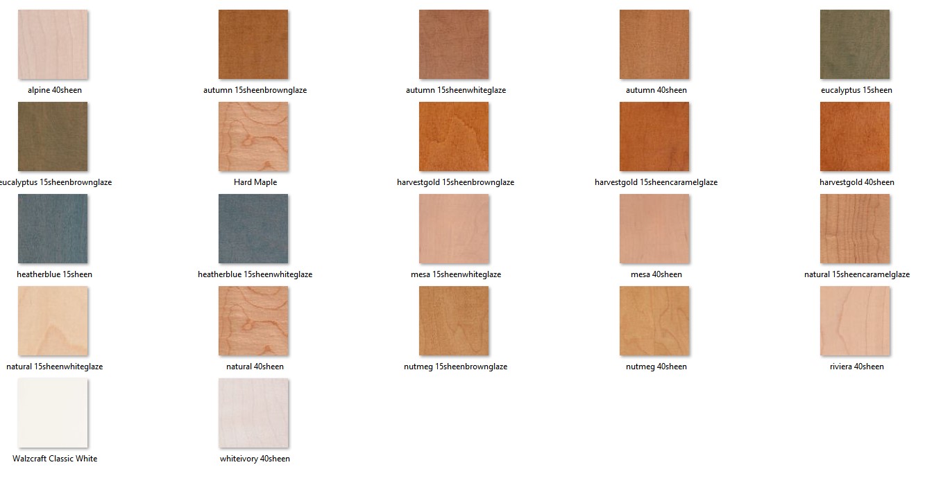 In that FINISHES file called HARD MAPLE, reside all the different stain colors that came with the program, all are 100x100 pixel .jpg images, and one I added that is the Walzcraft standard color I called Walzcraft Classic White. Before adding it, I made sure with an image editor it was 100x100.