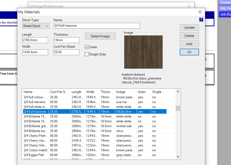 Sheet stock is "3/4 5x9 Karisma". Door material description is "3/4 4x8 Karisma"