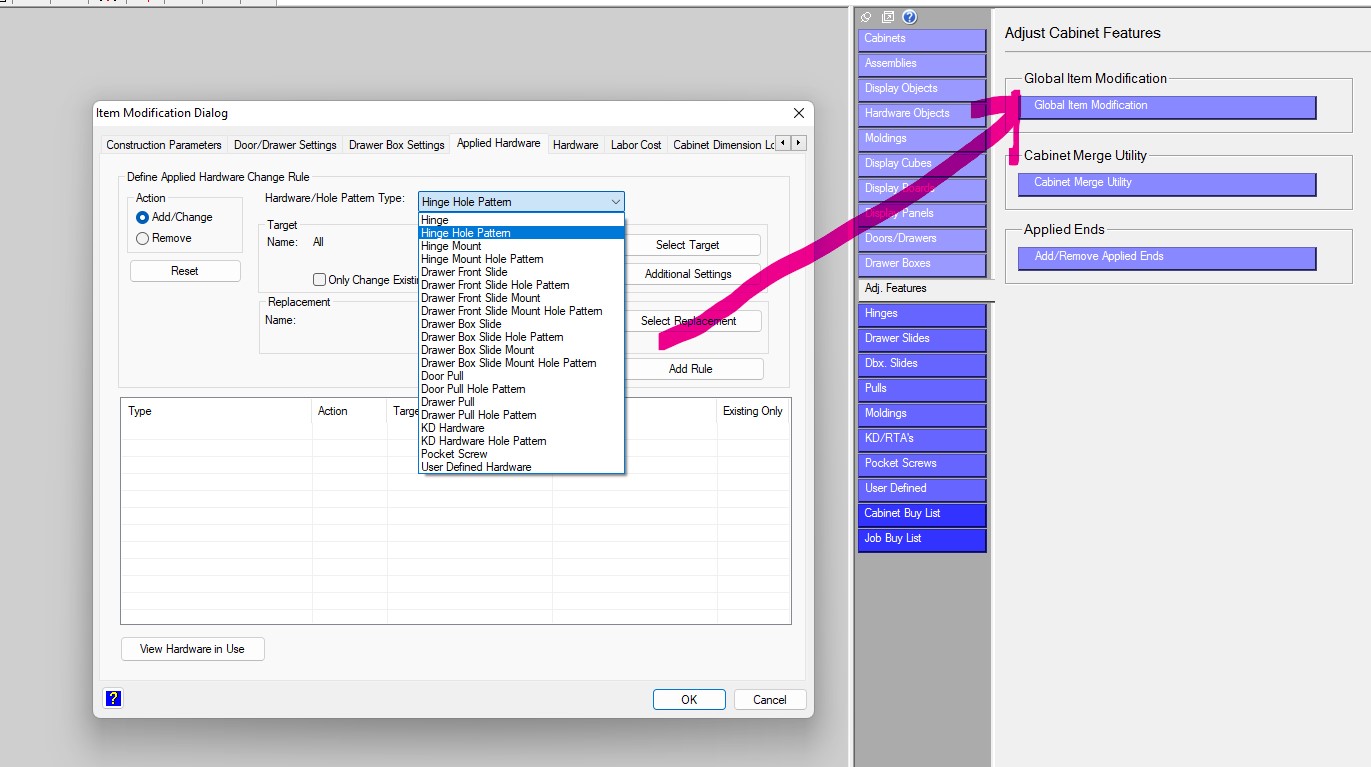 I have a question. Is it possible to change in eCabinets the Default Hardware and Hole Pattern in KD/RTA construction?