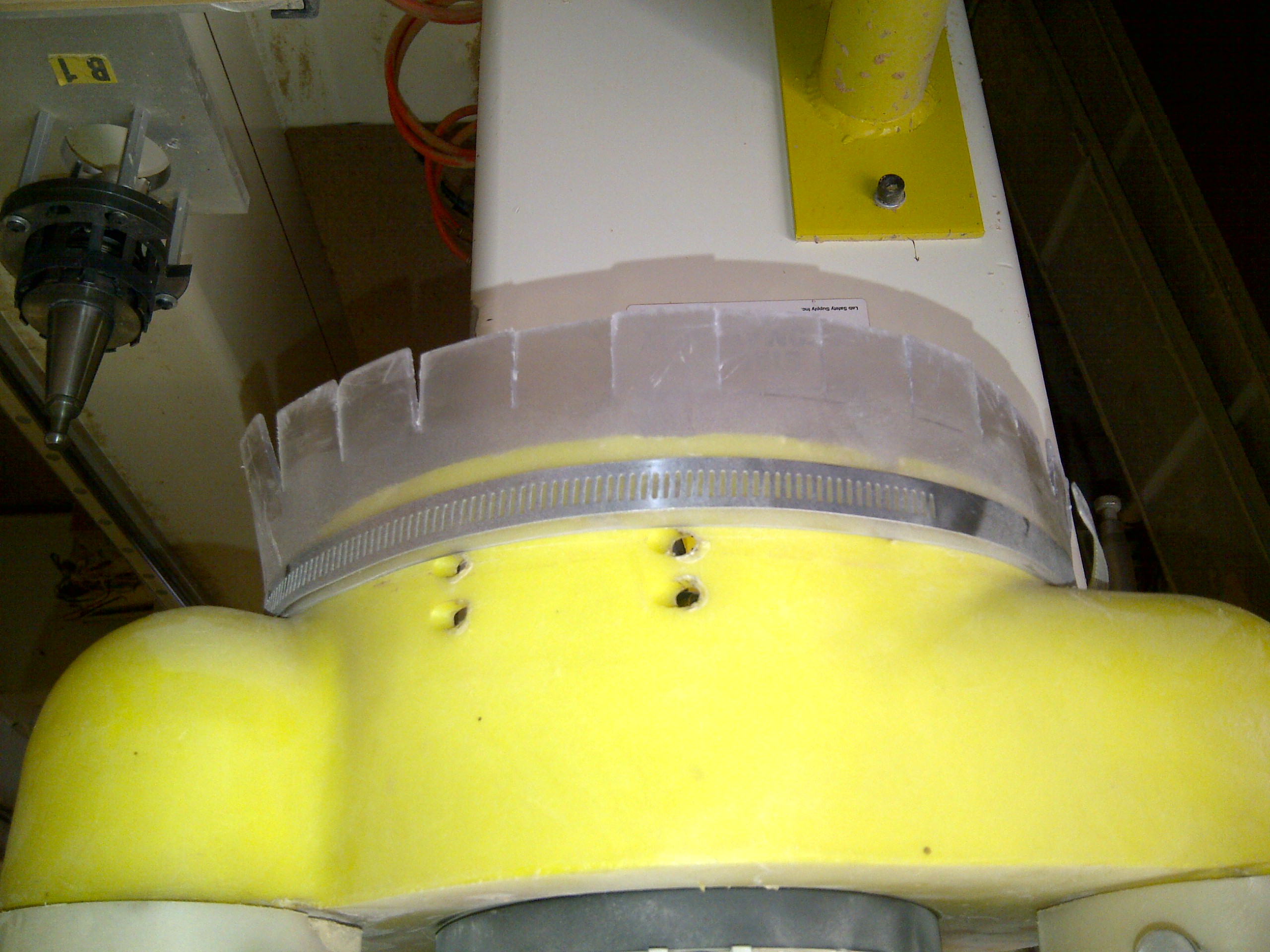 You should also check your static pressure at the main DC duct and at the spindle area. Don't know what you should have but when we put ours in back in 2008, the guy said ours was good, especially since we are running twin spindles on twin tables. We use a Blue Tornado system that is dedicated to the CNC. It goes something like 7" at the mouth of the cyclone to about 10" from the clean out and down shoot for a floor sweep with blast gate. At the top there is a TY that goes to 2 6" flex hoses down to the yellow tubes that split around the spindle and then rejoin at the tool holder on the spindle. We have a brush on this one and when we cut it is usually 3/4" longer than the top of the material. On our C40 we have a similar setup but with 1 4" flex coming down to a single yellow tube. Instead of a brush we have the clear PVC with no slots. Since we are always cutting Melamine on it we just push the PVC sleeve to within an 1/8" of the material and it cleans it out pretty good except for rooster tales and quick corners. When we had a slitted PVC sleeve or a brush on it we would use duct tape around the outside to help out.