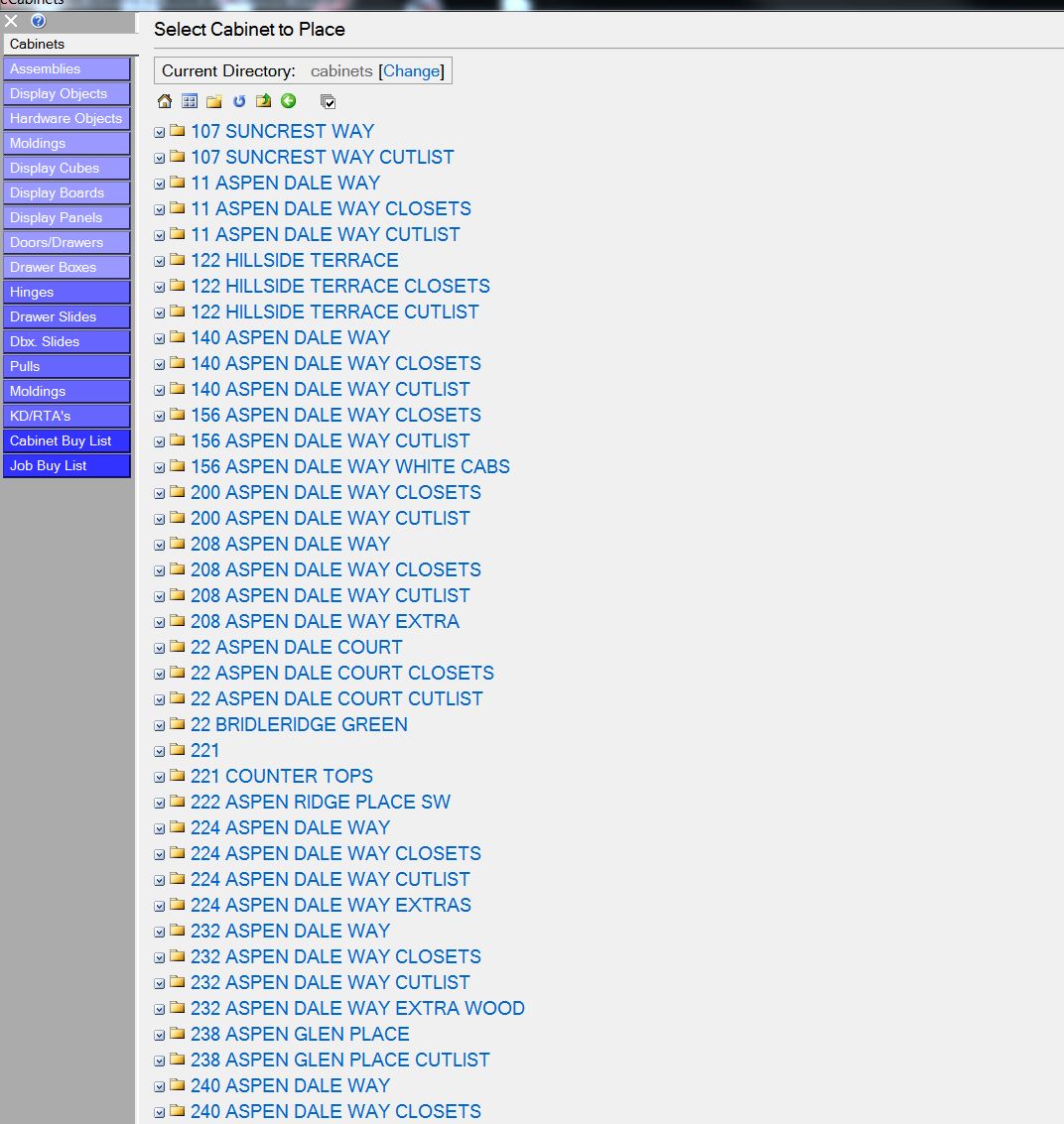 Thanks for the response Rick but I was looking for more of a general search that would cover all the cabinets jobs I have set up or Job files, assemblies,display objects and hardware. Don't know if I'm making sense or not :?