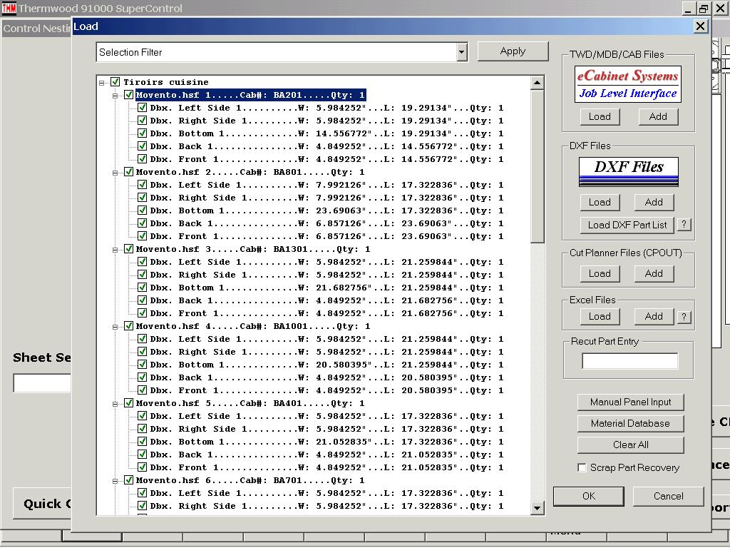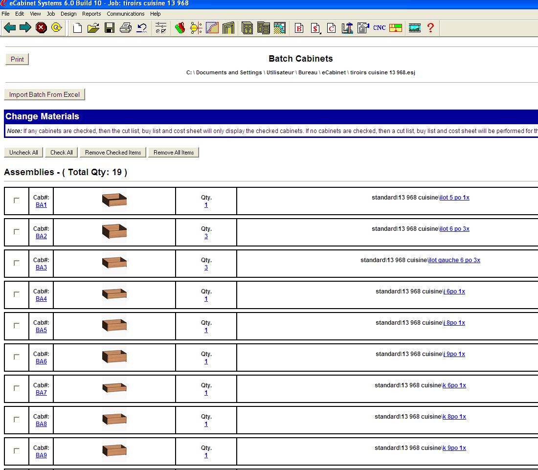 I use eCabinet V6 build 10 with control nesting v5.59 patch 2. When loading TWD files containing assemblies, all quantities are set to 1 even if I have different quantities in my batchlist. Also, the cabinet numbers generated by eCabinet are not matching in control nesting. Is it possible to cancel the cab# or change it for something else ? Here's an example below... I have no idea which drawer has to be in qty of 3... :wall: