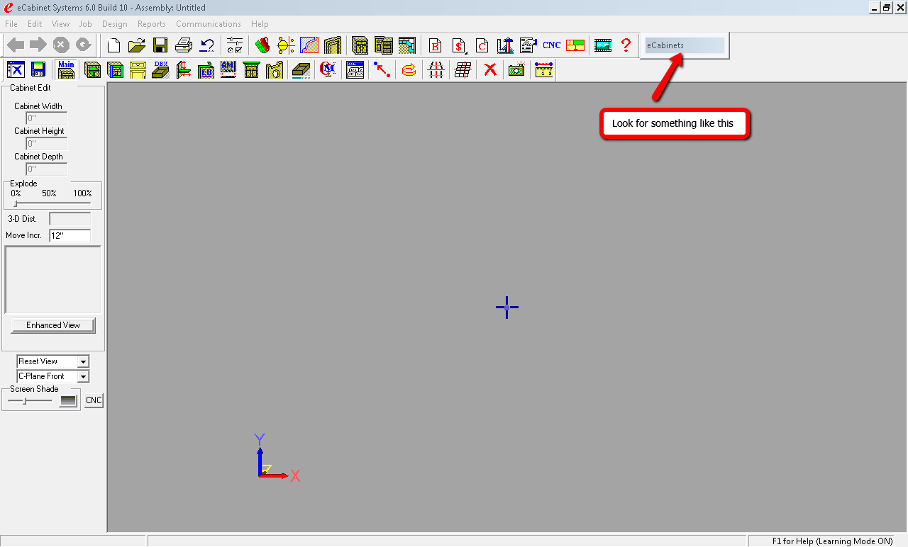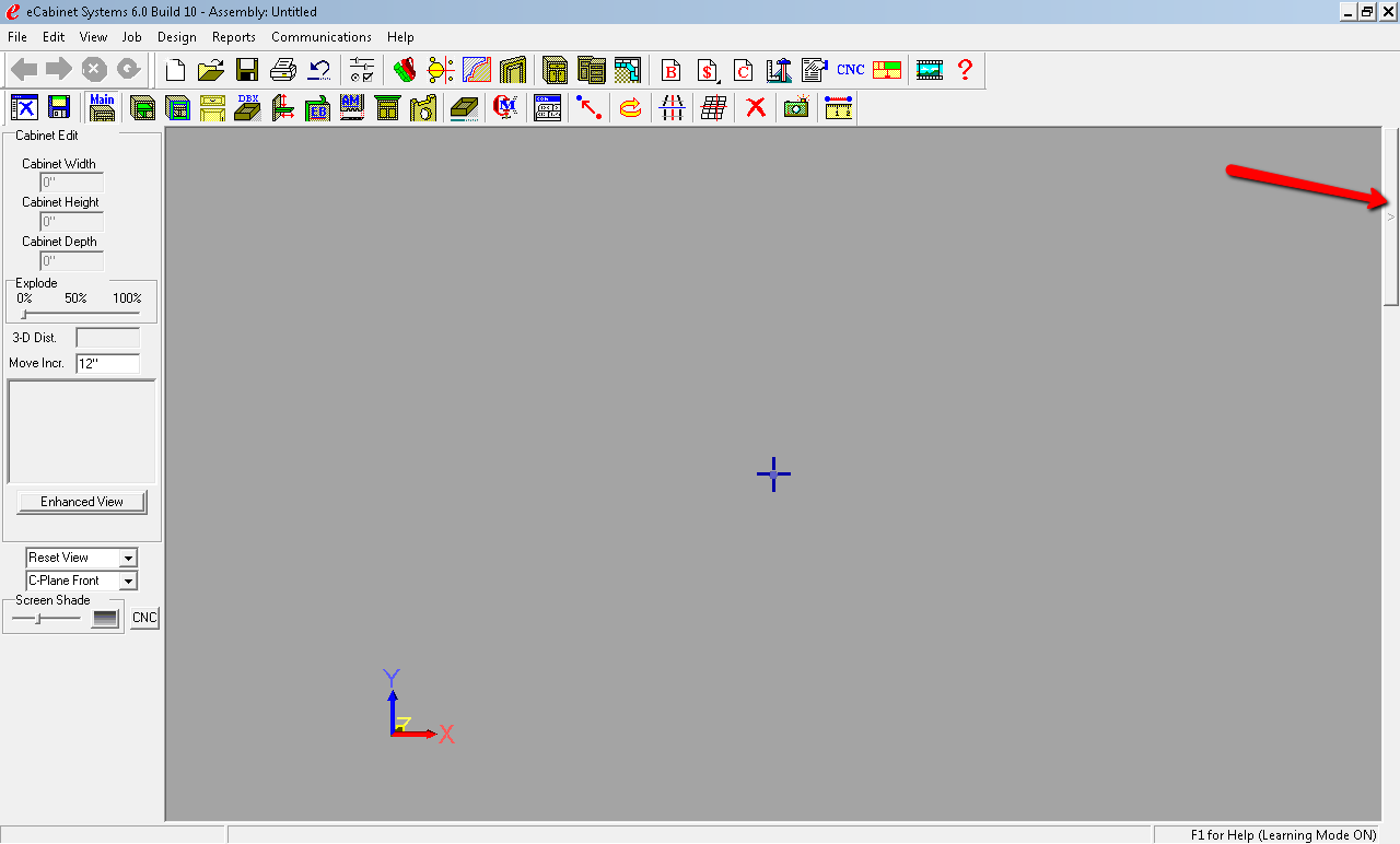 Last time I use the program all worked fine. Today I open the program and click on the cabinet editor and move my mouse pointer to the right hand edge of the screen as usual to access my libraries. Usually when I do this a dialog box pops out from the side of the screen and I can pick the standard library or one of my own. Now when I do this nothing happens, same results in batch cabinets, layout room and all usual places one would do this.