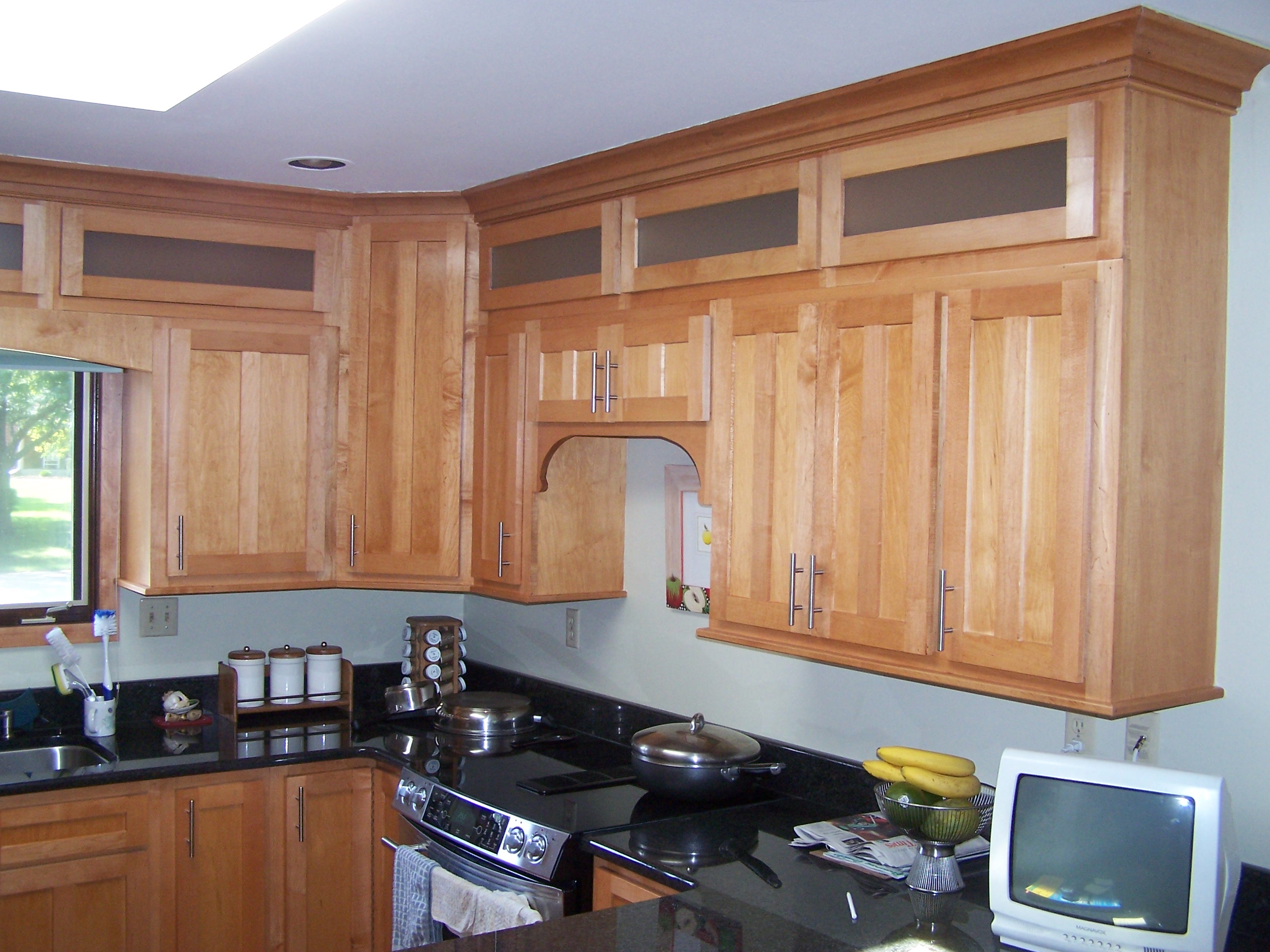 Here is a recent kitchen made of maple. It was a complete remodel. Frosted glass with flipper hinges help stow away items above the upper cabinets.