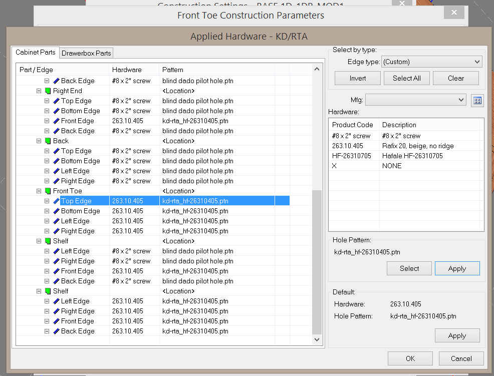 I'm hoping there's a forehead-smacking "doh!" answer to this, but I can't seem to find a way to clear the hole pattern and/or the hardware from any of the parts in the KD/RTA window. For instance, in this image, I want to remove the hardware and hole pattern from the top edge of the toekick so it doesn't get added & drilled. It seems like once the hardware and pattern have been specified, there is no way to un-specify them. What am I missing?