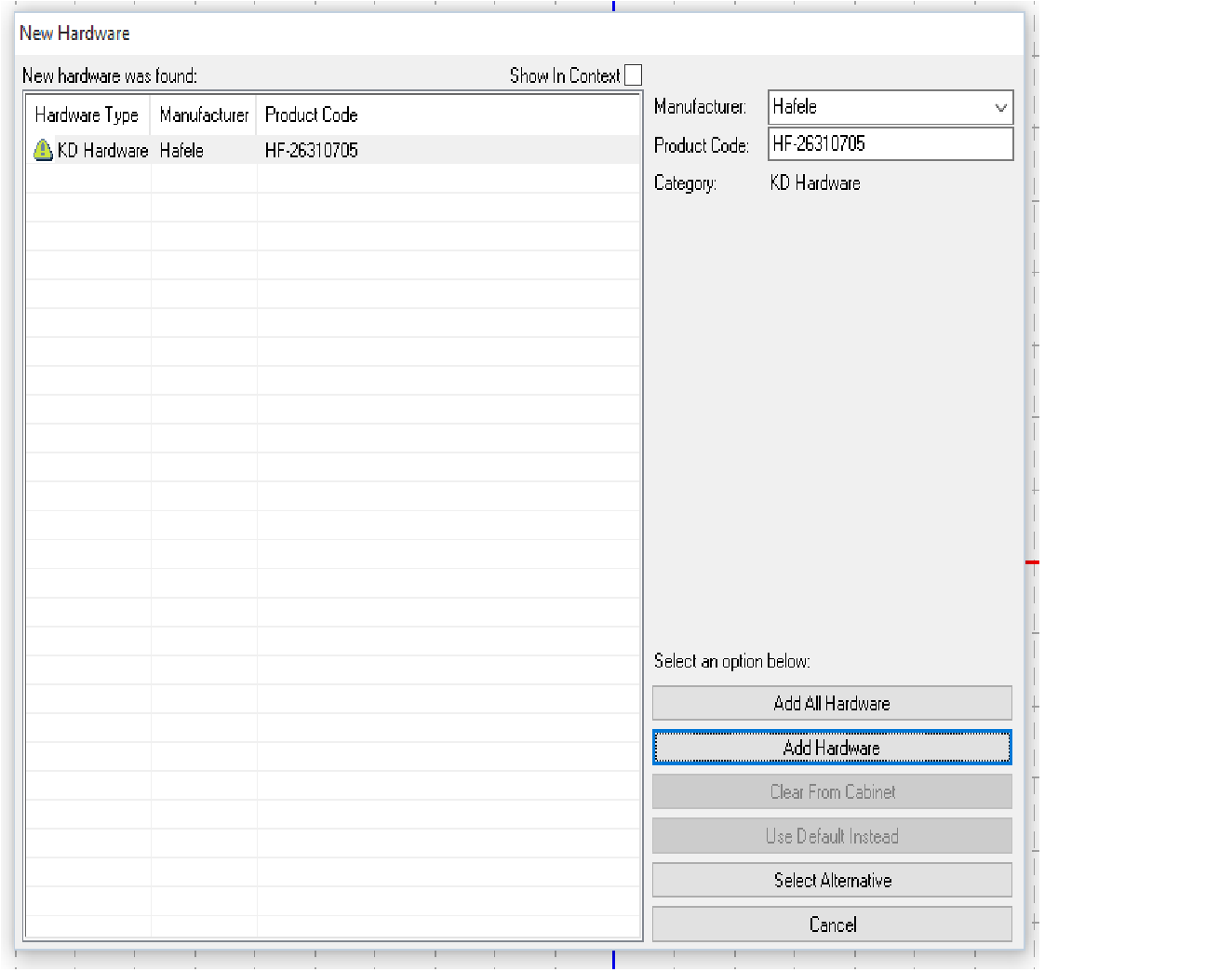 Now when you open the cabinet a dialog will pop up asking if you want to add the hardware.
