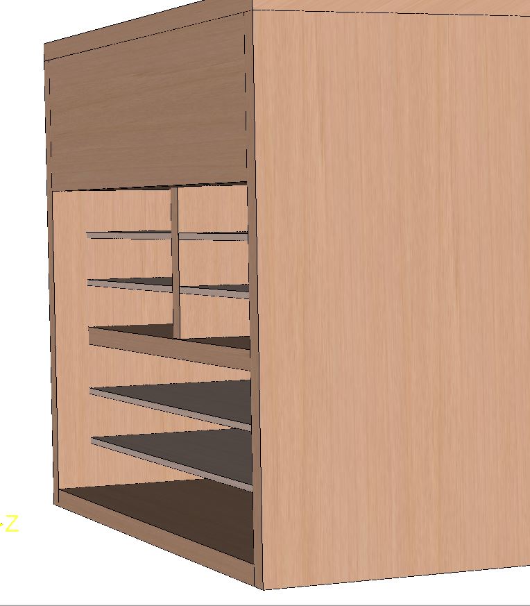 I first added the partition at 3/4" inset then adjusted the partition to 1.5" inset, added the fixed shelves on the left then the right,