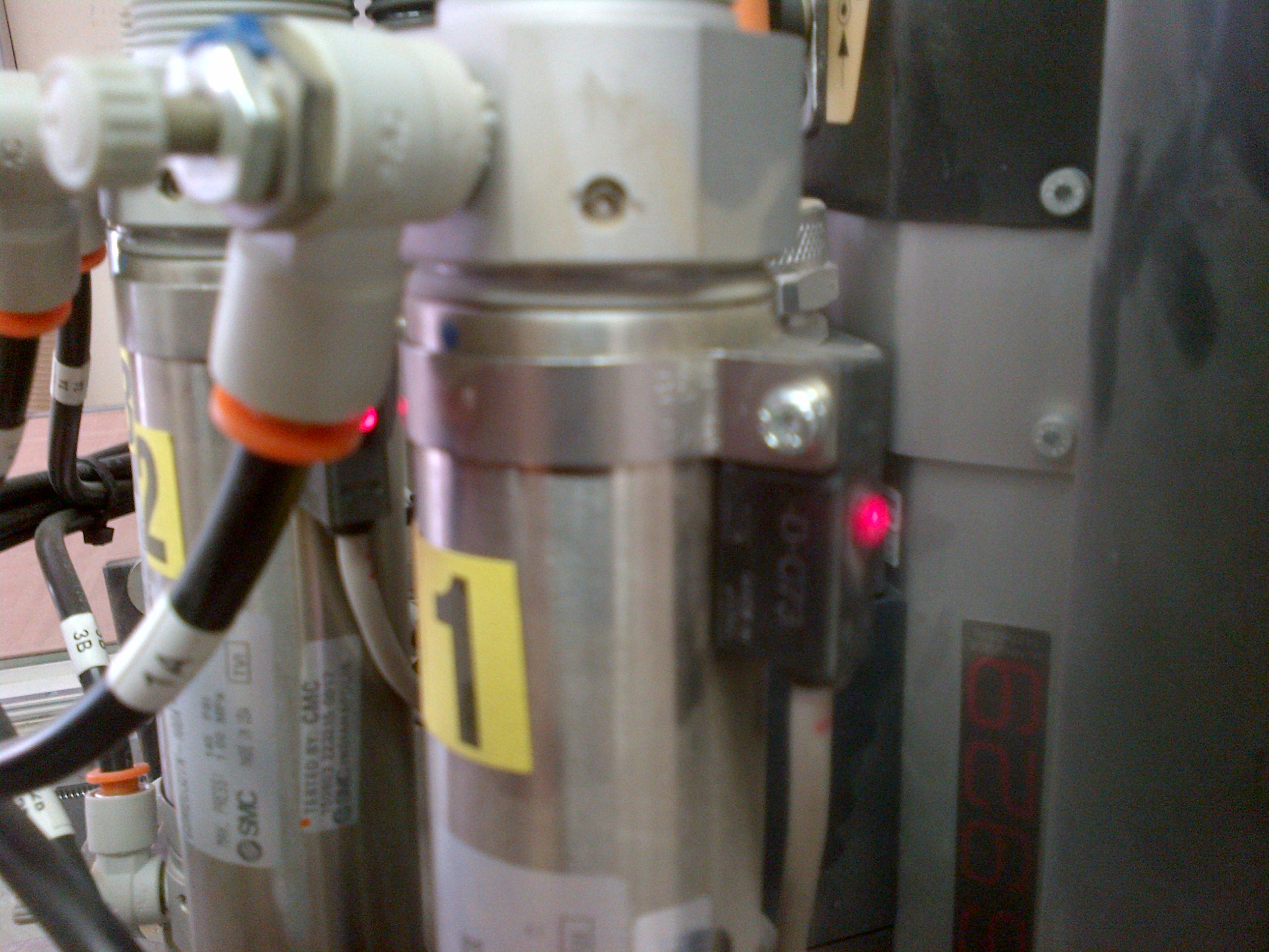 The position sensor seemed to be about 1/4" lower than the ones on the other cylinders, and indeed most of the time the red indicator light was not lit, which is what was triggering the error. It had not vibrated or slid out of place, as the screw and clamp were still plenty tight. We loosened the phillips head screw on the silver clamp ring and got it adjusted to the proper position. It works fine now.