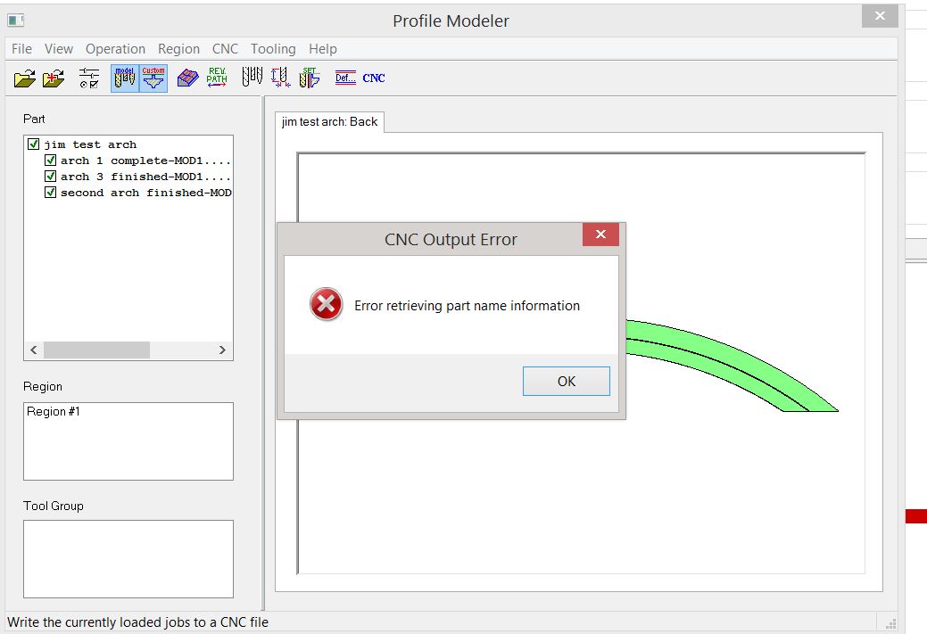 im using profile modeler for the first time in a very long time to cut this curved arch piece with a profiled edge running throught it and when I go to save I get an error message and same when I go to export to cnc. I cant proceed so any help with be greatly appreciated.