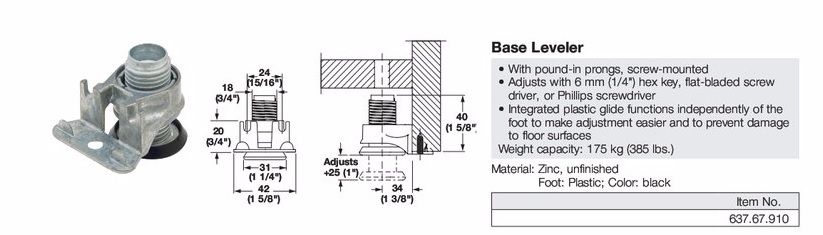I'm considering a few different ways of doing it, but am leaning toward bringing all side panels to the floor, adding 2 levelers (see attachment) to each, notching the front/bottom of each panel to receive a continuous quick piece. Shoe molding will be used as needed to cover gaps at the floor. Higher end jobs with have a flush kick, wrapped with a base molding.