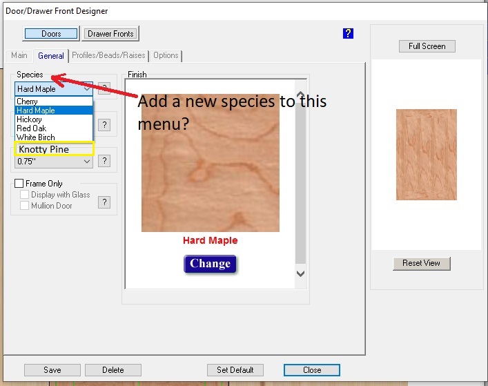Is there a way to add more material to the drop down list for doors and drawer fronts? I changed it in the door rails and stile set up but it did not change it. I need walnut as an option.