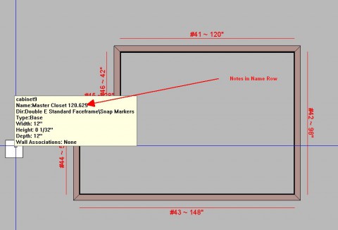 I would like an object like this that can be placed like a cabinet but doesn't register as a cabinet. (no cab number size wall associations etc.) The only thing I need is to mouse over it or select it and see the text I have entered as the name. To add notes I use the change name dialog.