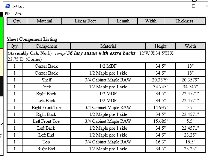 I added a fixed shelf as a stretcher to this cabinet. When nesting I noticed some extra parts. So I changes the back material to MDf to make it more visible in the cabinet editor since they are stacked. If you hold the cursor on any of the backs on the outside of the cabinet it says 1/2" MDF. When you hold the cursor on the inside it says 1/2" maple. Not a problem, I've already deleted the cabinet and reinstalled from my library. Thought the programmers might find it interesting.