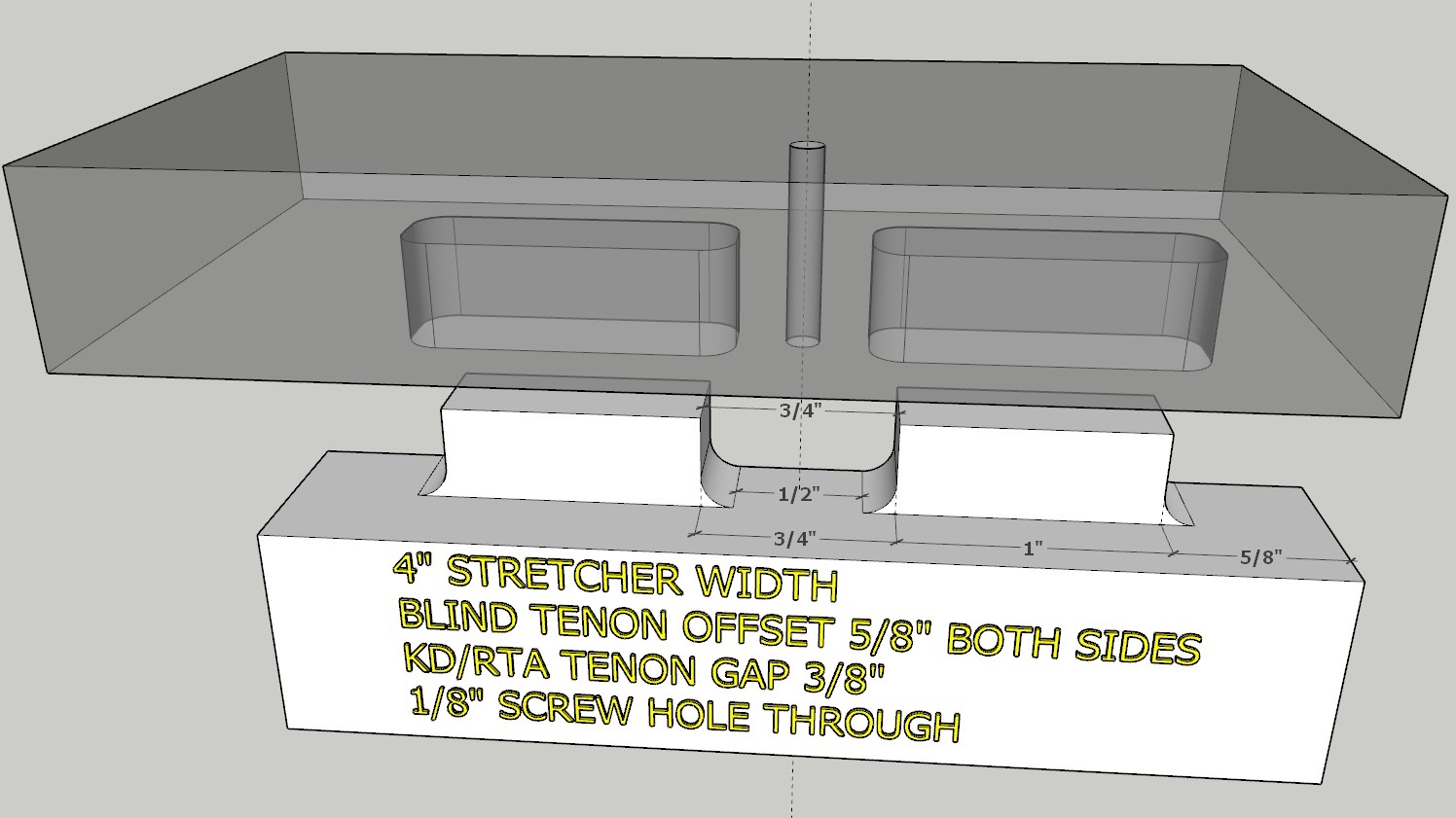I did the 3D model assuming a 1/4" diameter bit is used to cut the tenons (the thru cut) and the mortises (dados).