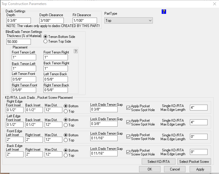 I am trying to arrive at a good standard for my seed builds, and what is displayed is the result of me specifying for 4" stretchers and back-edge tops in base cabinets with drawers, a lock dado joint with these settings
