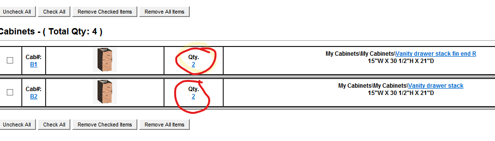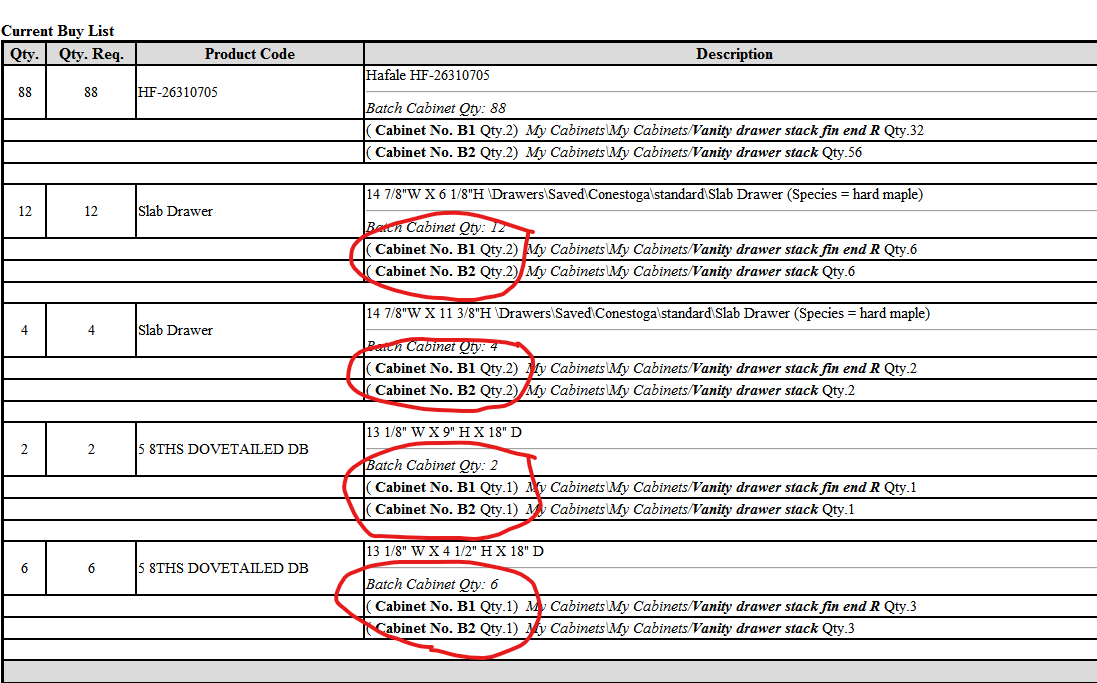 Download the batch, run a buy list, and look at the difference between how it represents cabinet quantities for drawerfronts versus drawerboxes. There are two each of two cabinets, the batch labels them B1 and B2.