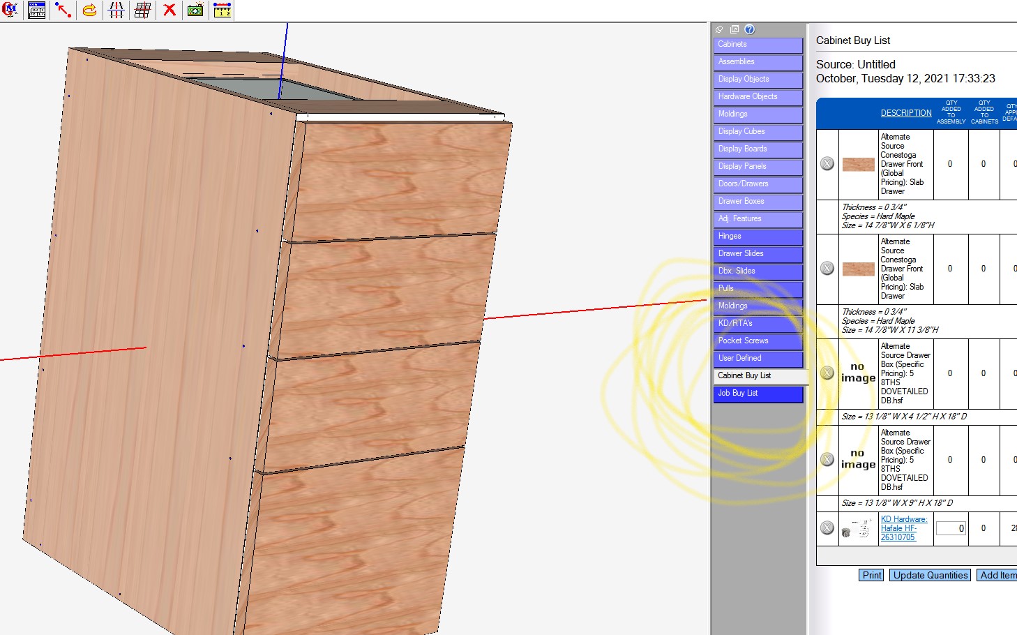 Just for the heck of it, I pulled up a three drawer stack and selected alternate price option. When I selected buy, It only showed two drawers, so you're right Gene, it's a bug of some kind. The cost sheet only shows two as well, but the cut list shows three.
